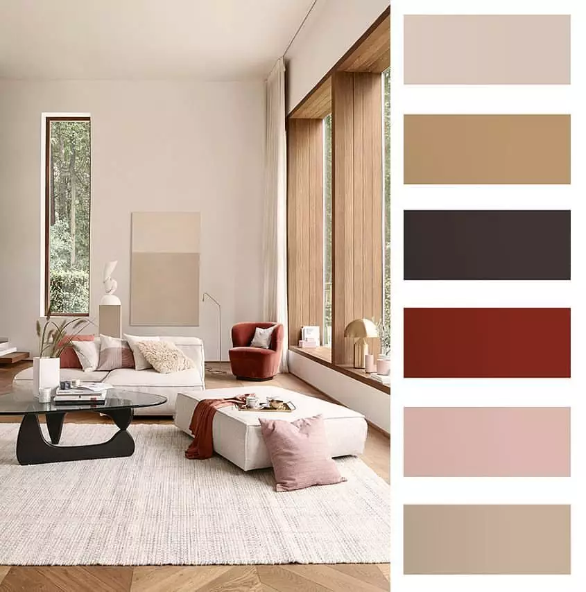 Все они образованы из желтого и красного цветов, более-менее разбавленных белым, серым или черным. Однако эти цвета наделены такими характеристиками, как насыщенность и светлота. Несмотря на это, все они обладают спокойным, умиротворяющим настроением и могут стать как основой любого интерьера, так и выступить акцентом.