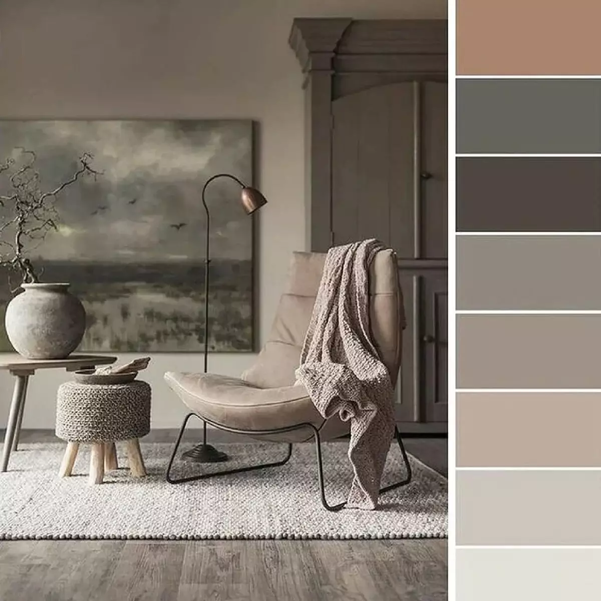 В дизайне интерьера ахроматические цвета попадают в так называемую нейтральную палитру, так как черный, серый и белый становятся отличным фоном для хроматических акцентов, а также различных видов фактур и декора. Однако если мы говорим о нейтральности, то нельзя не упомянуть о более выразительных цветах, а именно о тех, которые относятся к коричнево-бежевой гамме. Из их: