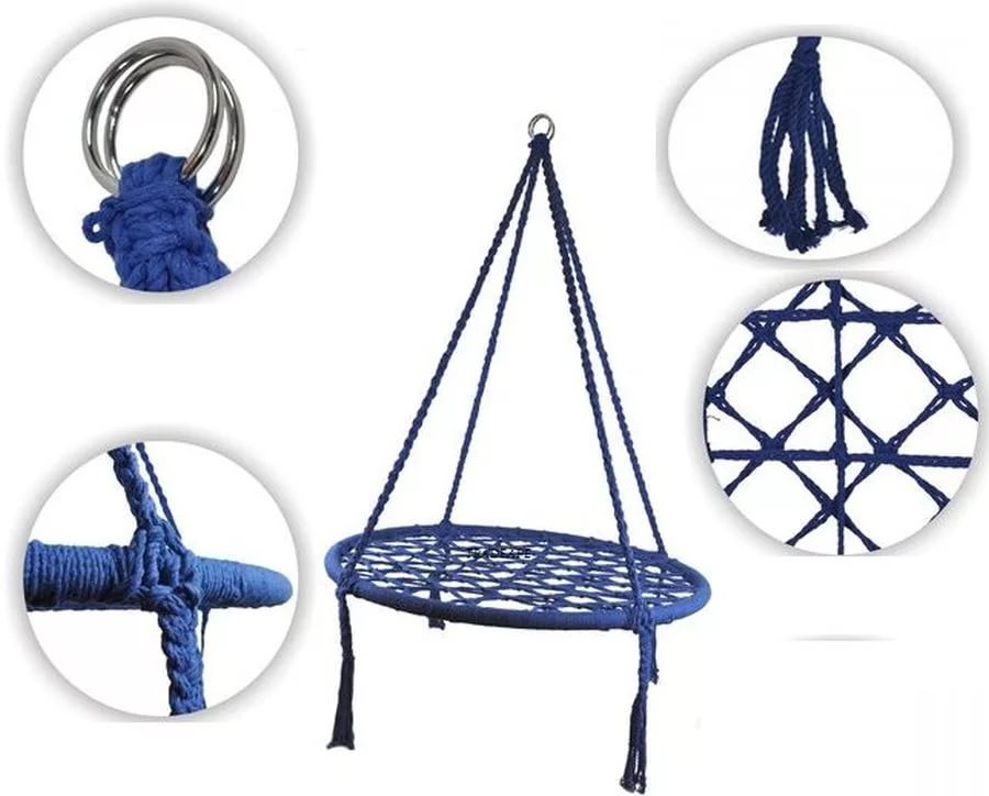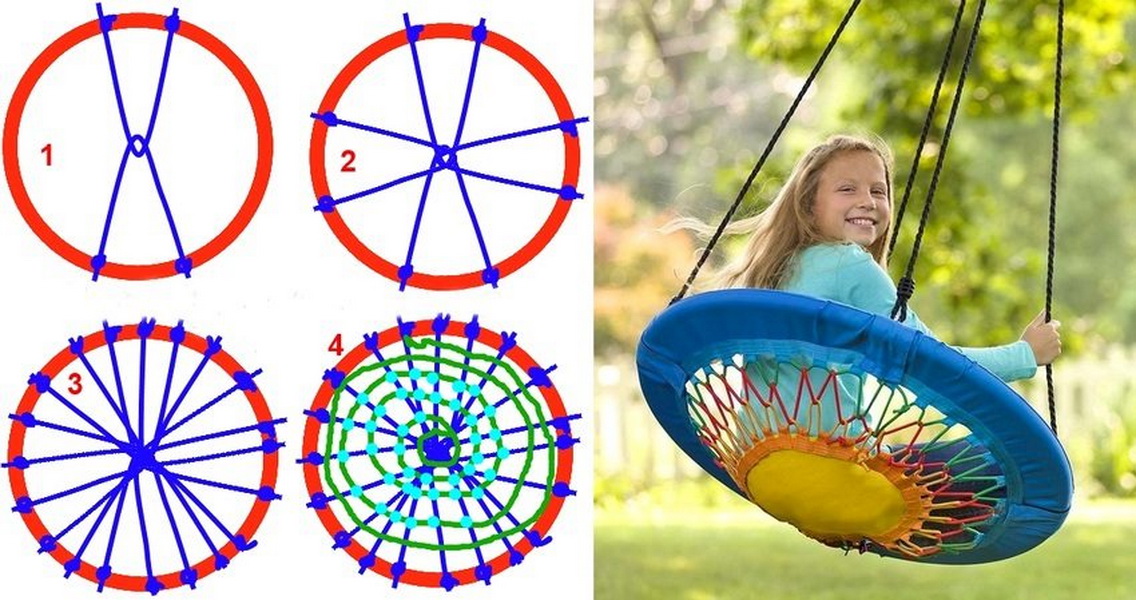 Такая форма представляет собой своеобразный гамак качели с плетеным сиденьем. Чтобы не сооружать каркас для плетеной основы, берут обычный обруч и оплетают его. Подвесы делают из прочных канатов или альпинистского троса. Особенность системы – трос собирают в кучу, фиксируют в одной точке. Получают домашний аттракцион, на котором можно не только качаться, но и крутиться.