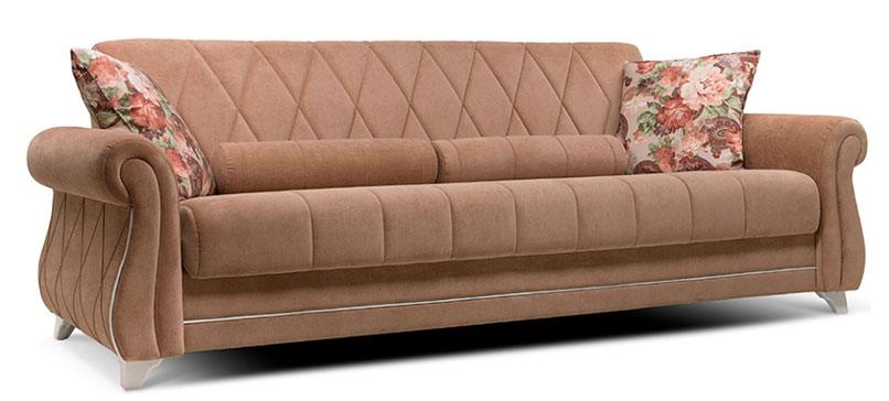 “Роуз” от “Нижегородмебель и К” – роскошный экземпляр за 28 000 рублей. Отлично впишется в современную обстановку и в помещение стиля прованс. Обивка выполнена из велюра в четырех расцветках. Он оборудован механизмом “книжка с нулевой стеной”. Каркас сделан из бруса, ЛДСП и мебельной фанеры. Наполнитель – поролон.