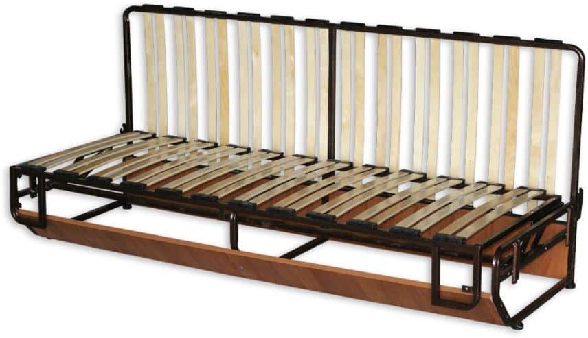 - Телескоп – под диваном имеется деревянное основание на колесиках, которое выкатывается при трансформации. На сиденье лежит сложенный вдвое матрас. Именно его и спинку нужно уложить на основу, чтобы получить койку. Ложе получается почти на полу, да и от частого перемещения на напольной поверхности образуются царапины.