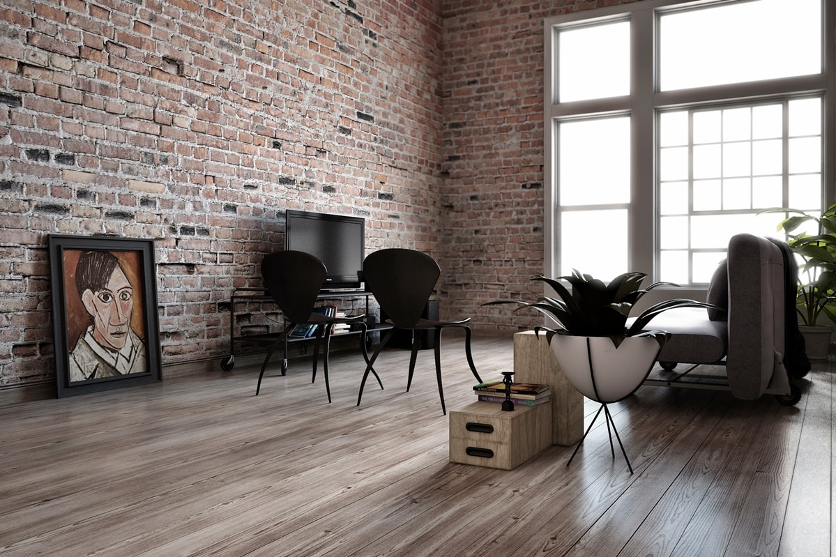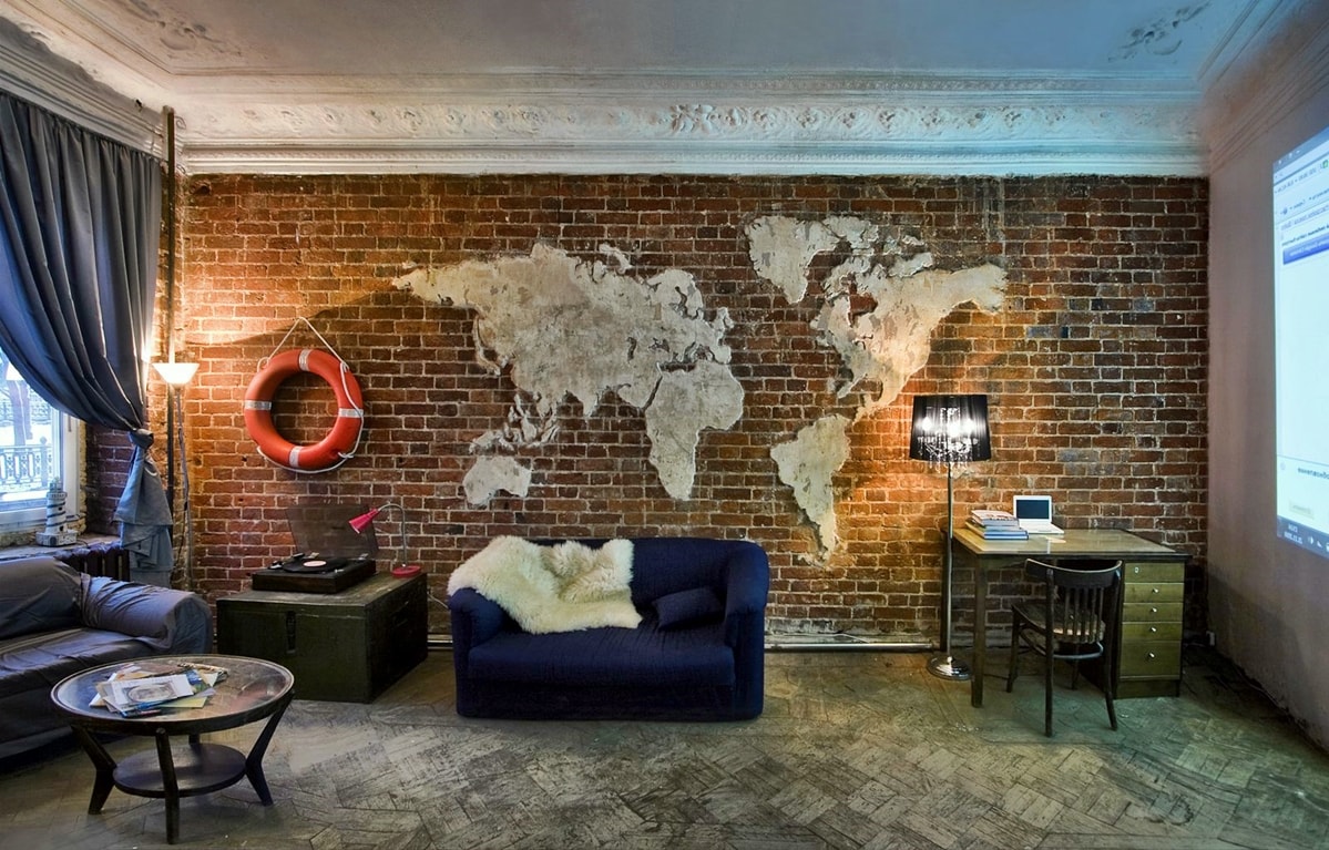 3) Кирпич. Чаще всего используется как главный акцент в помещении, главная кирпичная стена комбинируется с остальными базовыми стенами – штукатуркой или бетоном. Главное – подобрать правильное цветовое решение – состаренный классический красный кирпич или же светлый, более уютный вариант.