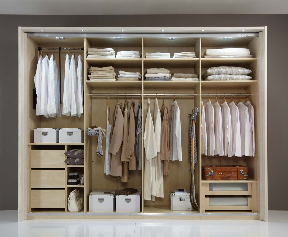 Для двухдверных и трехдверных шкафов вариантов заполнения намного больше, чем для однодверного. Среди вещей, предназначенных для хранения, могут быть постельные принадлежности, сезонная одежда, скатерти, полотенца, журналы и даже встроенные секции для бижутерии и косметических принадлежностей.