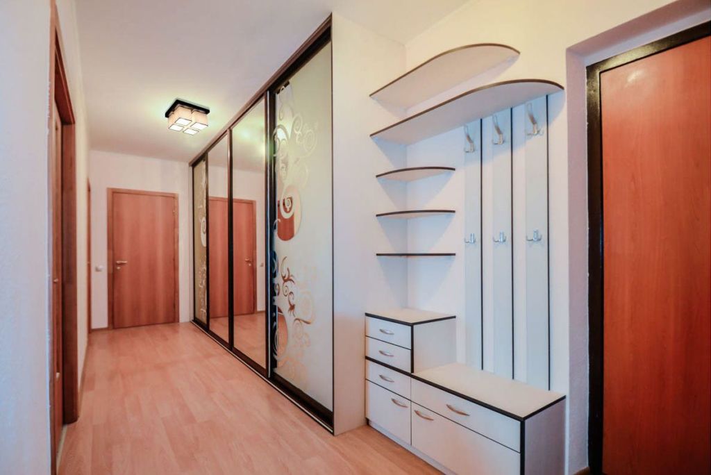 Довольно удобны в прихожей встроенные шкафы-купе. Верхняя планка заходит под потолок. Свободного пространства не остается и по бокам. Таким образом вся площадь задействуется по-максимуму.