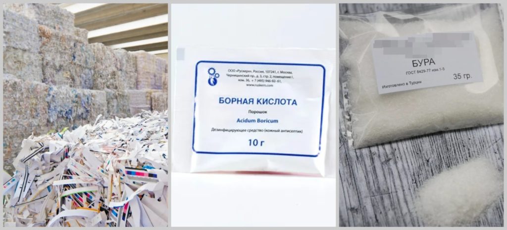 После того как макулатура будет должным образом измельчена, полученная субстанция несколько раз пропитывается растворами борной кислоты и буры, после чего просушивается.