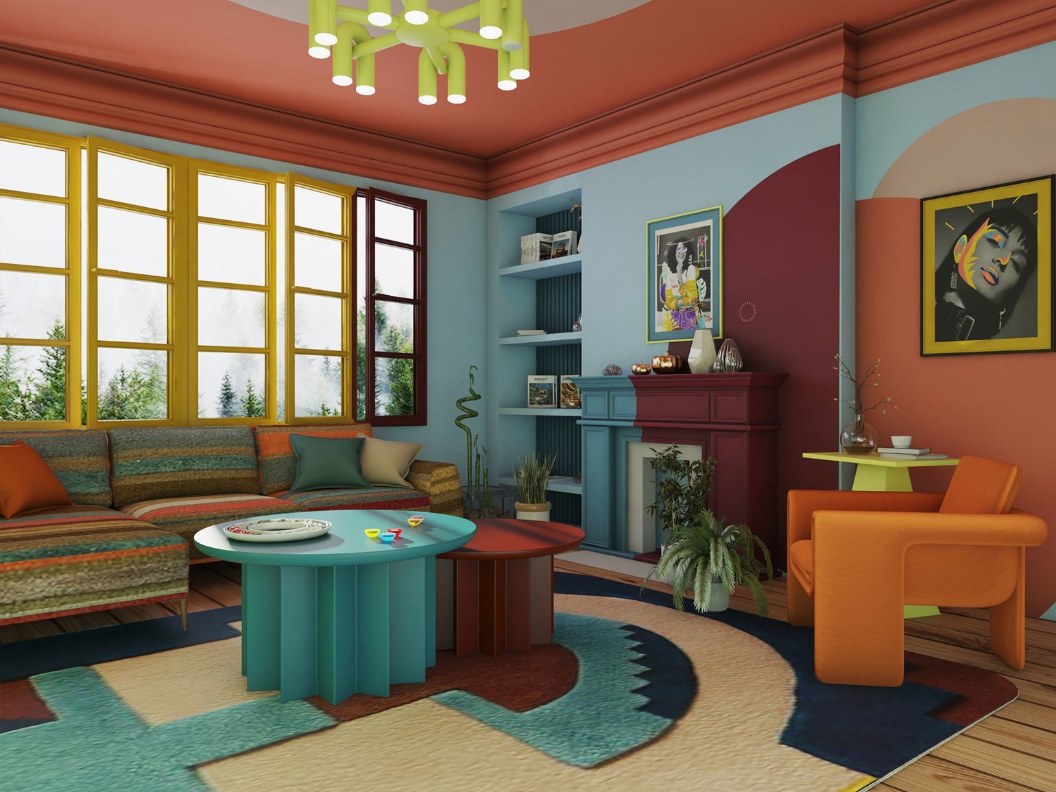 Зонируют пространство с помощью мебели, как правило, мягкой, округлой формы. Такой интерьер обычно оформляют яркими мультяшными цветами: жёлтым, красным, насыщенным синим, фиолетовым, розовым. Обязательны элементы современного искусства, показывающие вкус владельца: картины, постеры, афиши, комиксы, портреты знаменитостей ― дань массовой культуре.