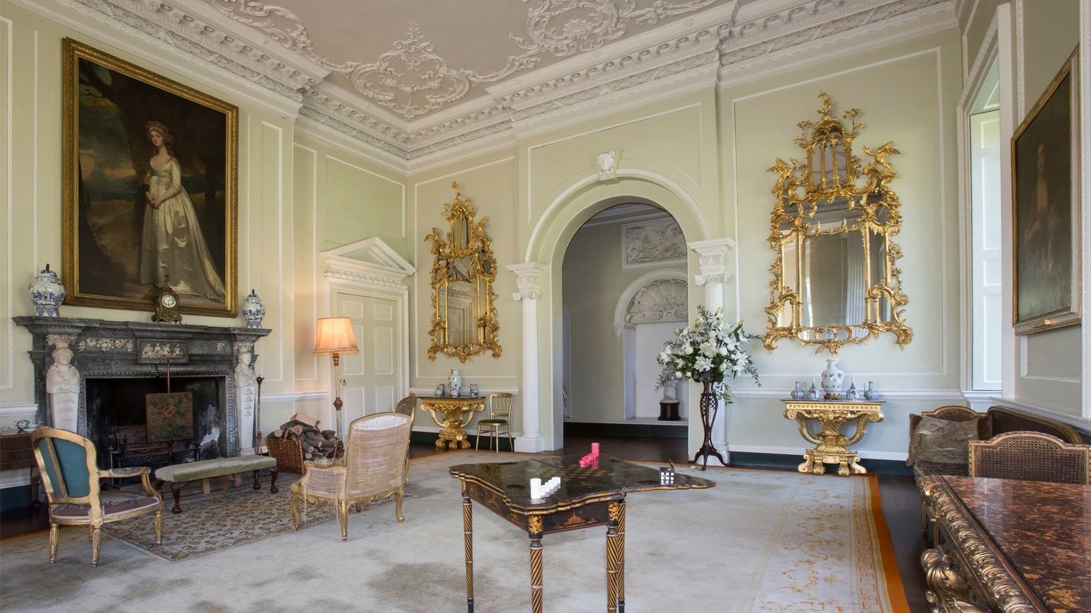 Ключевые элементы. Это атрибуты античности ― колонны, лепнина, арки, тяжёлые портьеры, украшения в виде львов, лавровых листьев. В цветовой палитре используют белый, беж, благородные оттенки красного, синего, зелёного. В оформлении много позолоченных или серебряных элементов, несколько источников освещения: крупные люстры со сложным дизайном, светильники, канделябры.