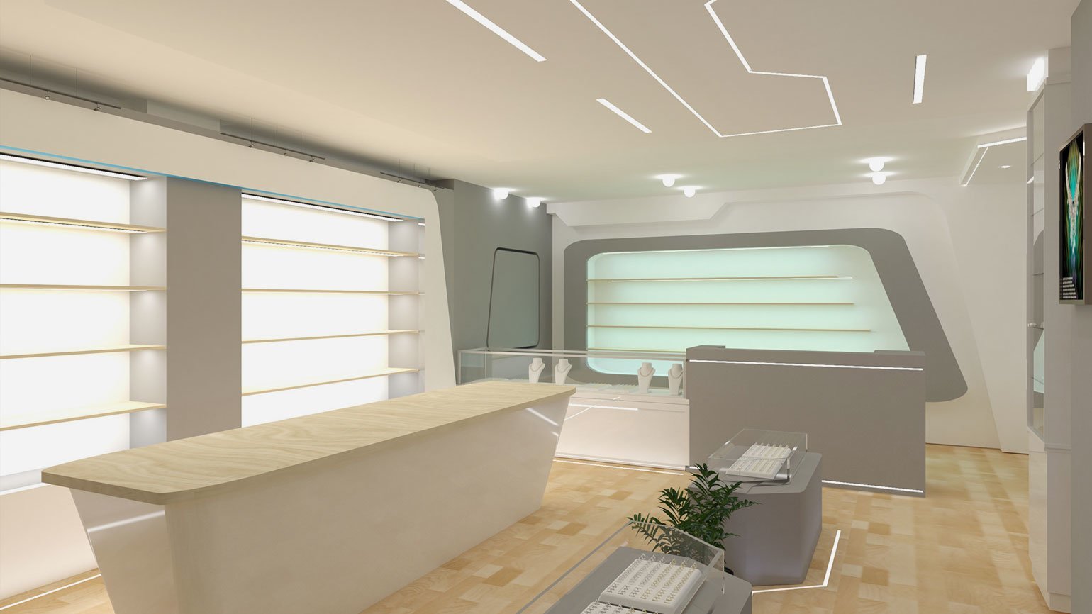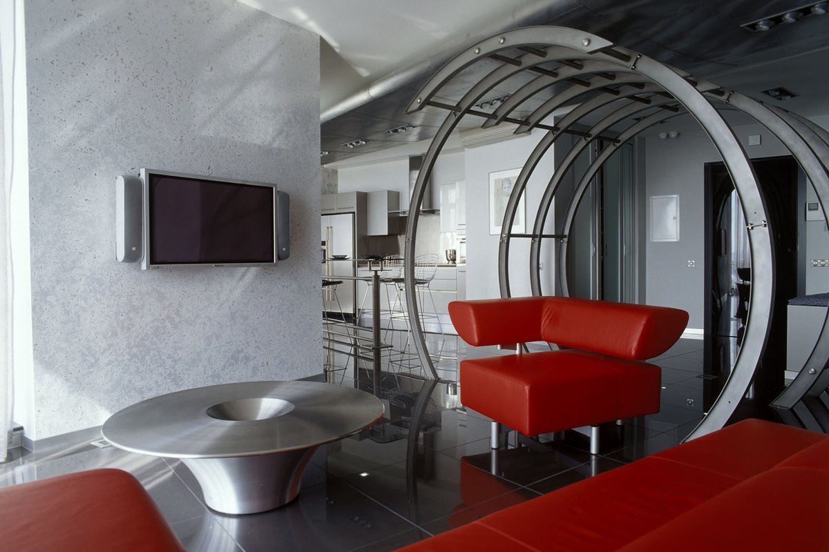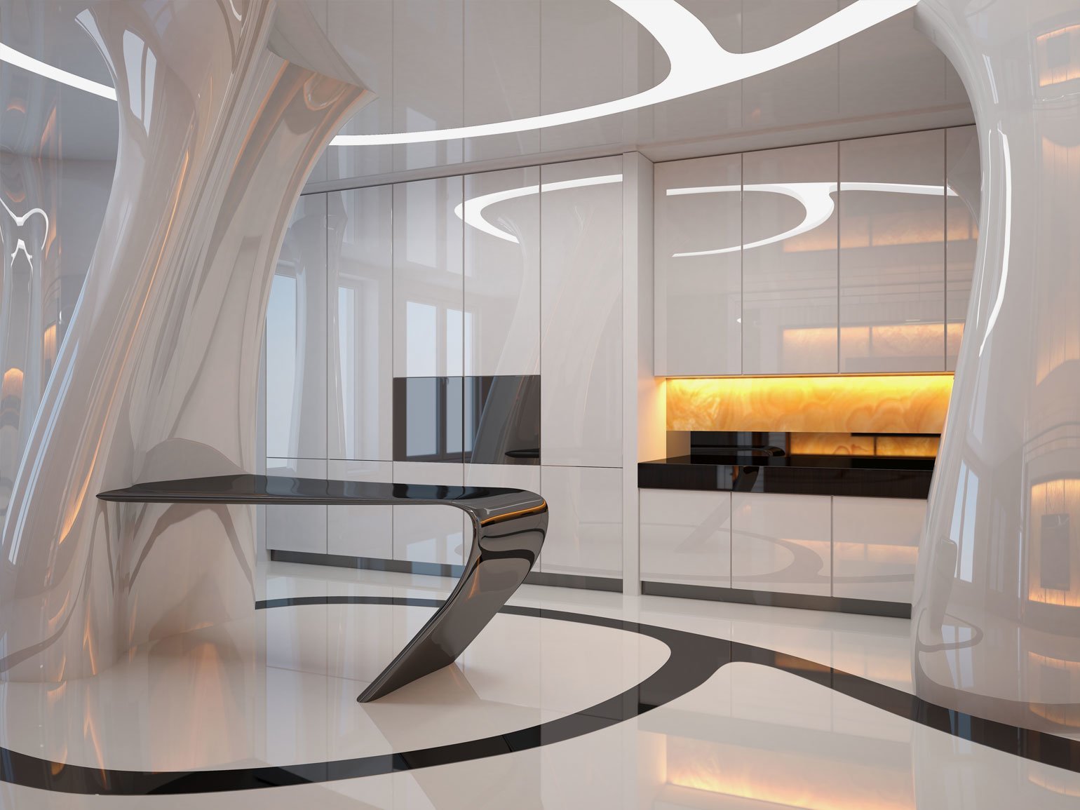 В таком интерьере преобладают обтекаемые формы, холодные цвета, глянцевые поверхности ― так в фильмах изображают космические корабли или дома в технологическом будущем.