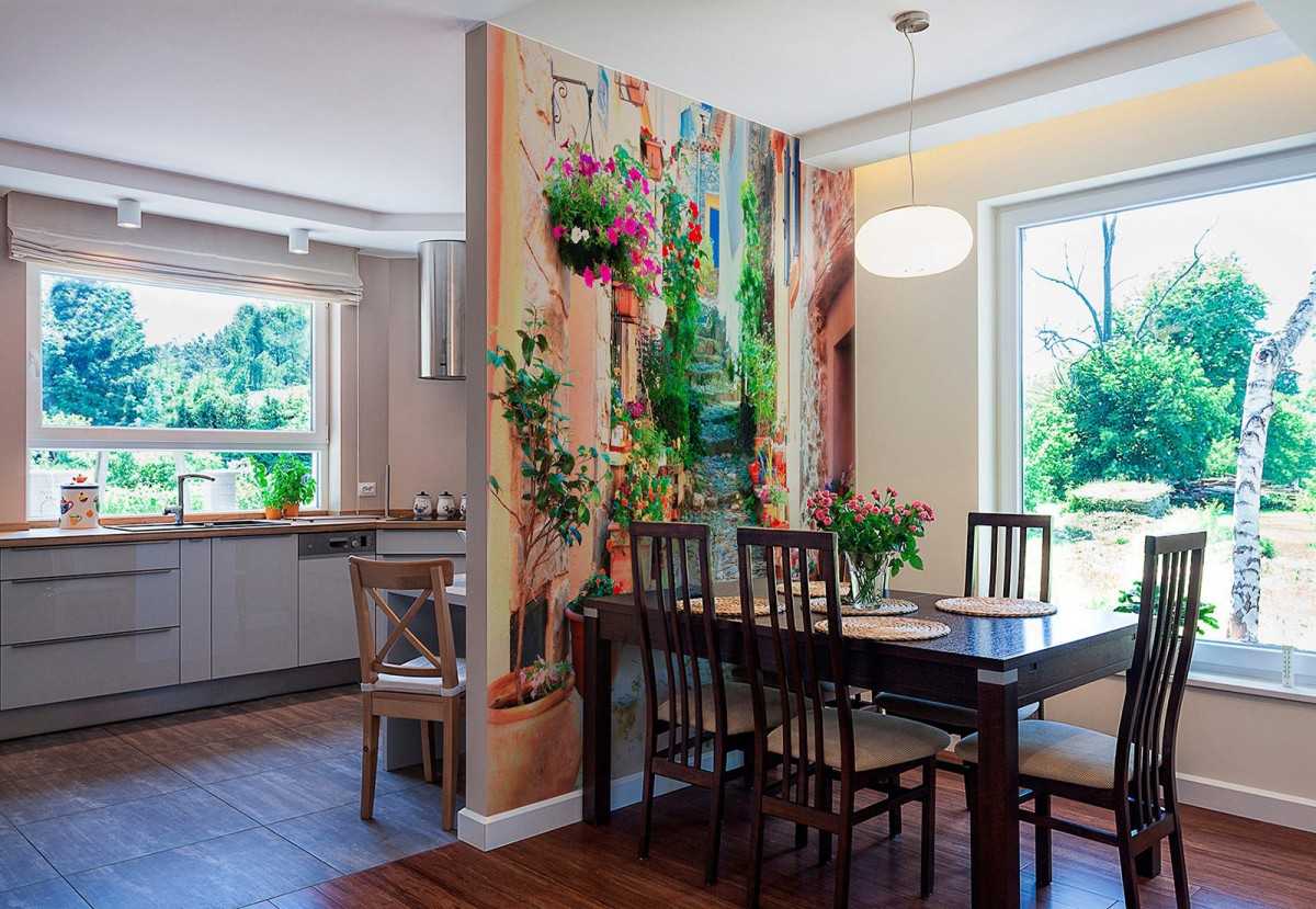 Наконец, фотообои не должны отрываться от общей цветовой гаммы помещения. Расширяющий эффект будет достигнут только тогда, когда фотообои становятся частью комнаты, потому если на панно, например, изображена дорожка в цветущем саду, то около стены можно поставить горшок с цветами, а фото прованской улицы можно дополнить легким ажурным столиком.