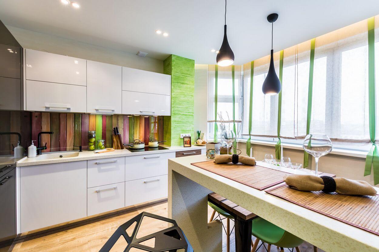 Если кухня очень маленькая, то ее совмещают с частью коридора, гостиной или с балконом. Образовавшееся дополнительное место на лоджии переоборудуют под чайную, обеденную зону или оснащают барной стойкой.