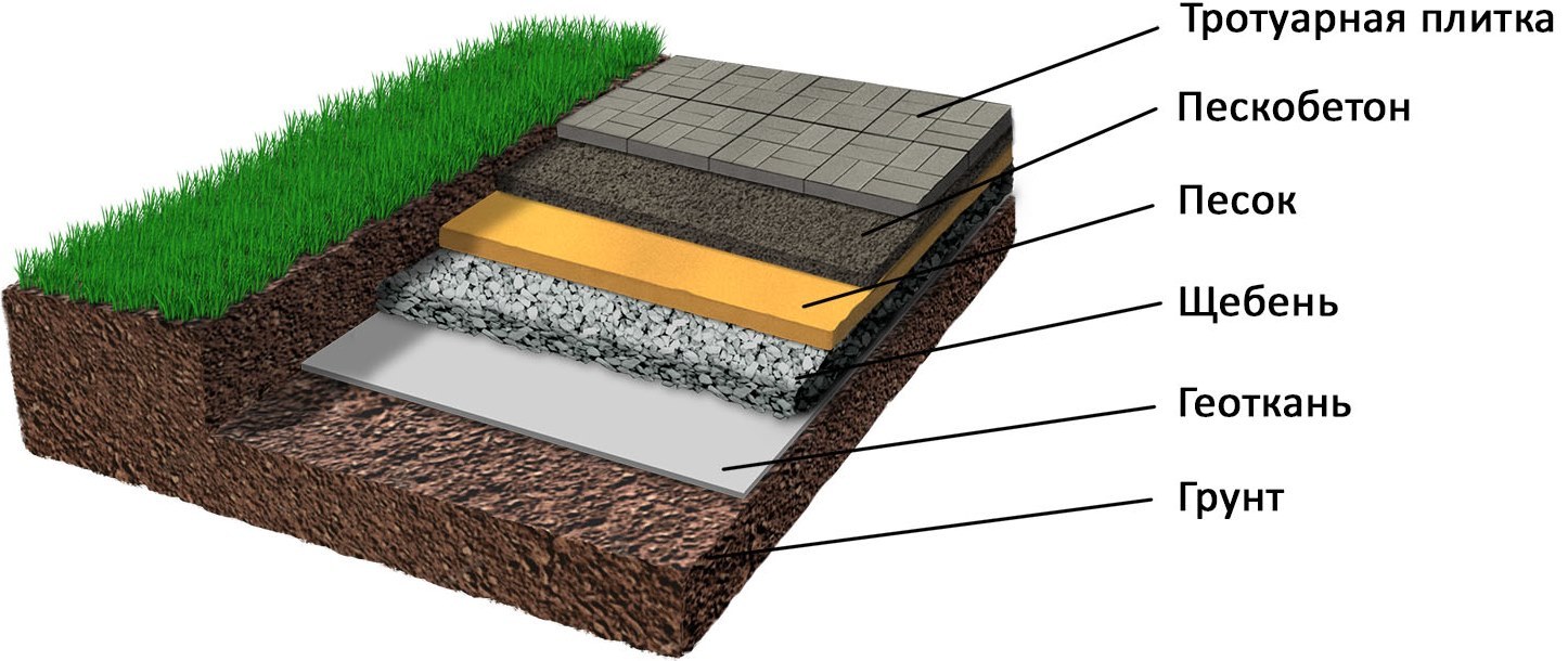 На дно траншеи насыпают слой щебня или гравия толщиной до 5 см. Затем поверхность выстилают геотекстилем или агроволокном. Такая подушка необходима для сооружения дренажа – он впитает и отведет избытки воды. На текстиль насыпают слой песка толщиной до 5 см. Поверх уплотненной песчаной посыпки выкладывают гравий. Размер слоя от 10 см. После этого засыпку хорошо трамбуют, чтобы не просело финишное покрытие.