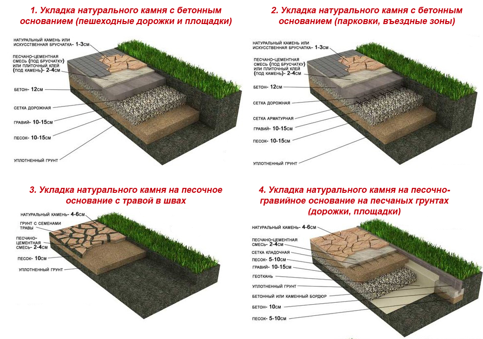 Природный камень укладывают на песчаное основание, либо на землю в виде ровных тропинок или хаотично распадающихся участков. Природный материал прекрасно сочетается с другими видами отделки дорожного покрытия.