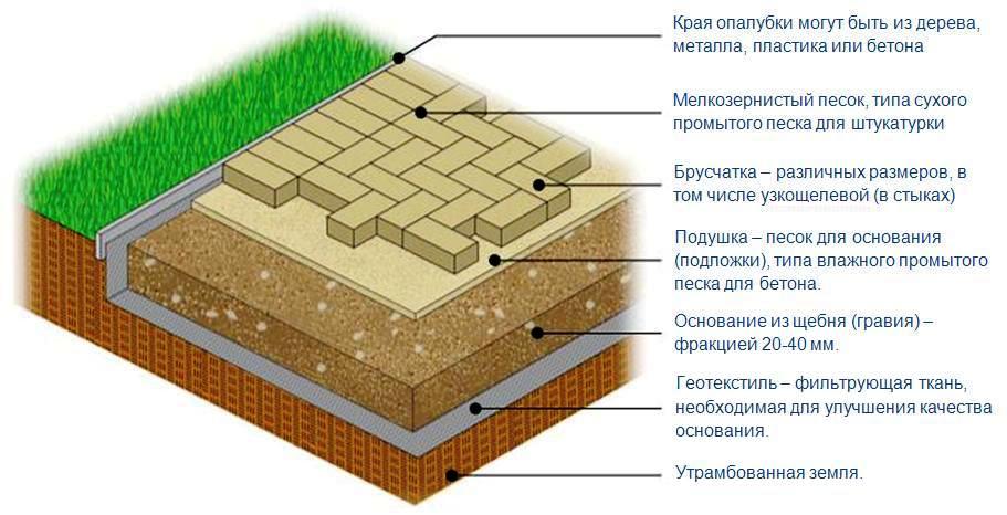 Последние уместны лишь на завершающем этапе, они смоют излишки песка, отполируют камни и уплотнят верхний слой. Выбирать материал в зависимости от грунта. Важно определить уровень грунтовых вод и механический состав самого грунта. От этого зависит долголетие использования покрытия и трудозатраты в процессе мощения. Подготовка места, грунта. После разметки дорожек посредством шнура и колышков лопатой на участке снимается дерн. Нужно выкопать траншею, высота которой определяется в зависимости от высоты песчаной подушки. Чаще всего приходится использовать песок, его выравнивают и утрамбовывают. Для большей надежности засыпаются щебенка или гравий.