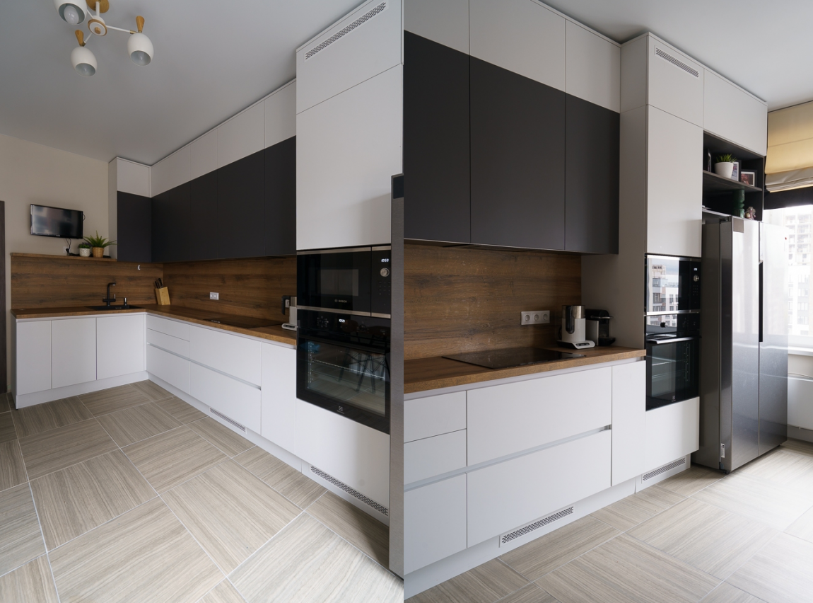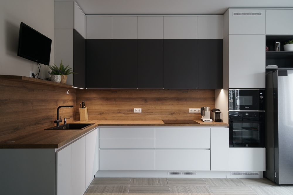 У профессиональных дизайнеров есть негласное правило — кухонный фартук и столешница делать в одной цветовой гамме. Это простое решение, но не стоит забывать про общую композицию. Среди базовых комбинаций можете смело использовать: комбинацию дерево и камень в обоих направлениях, классическое сочетание белого фартука и черных фасадов. Такие дизайнерские решения будут актуальны долгое время.