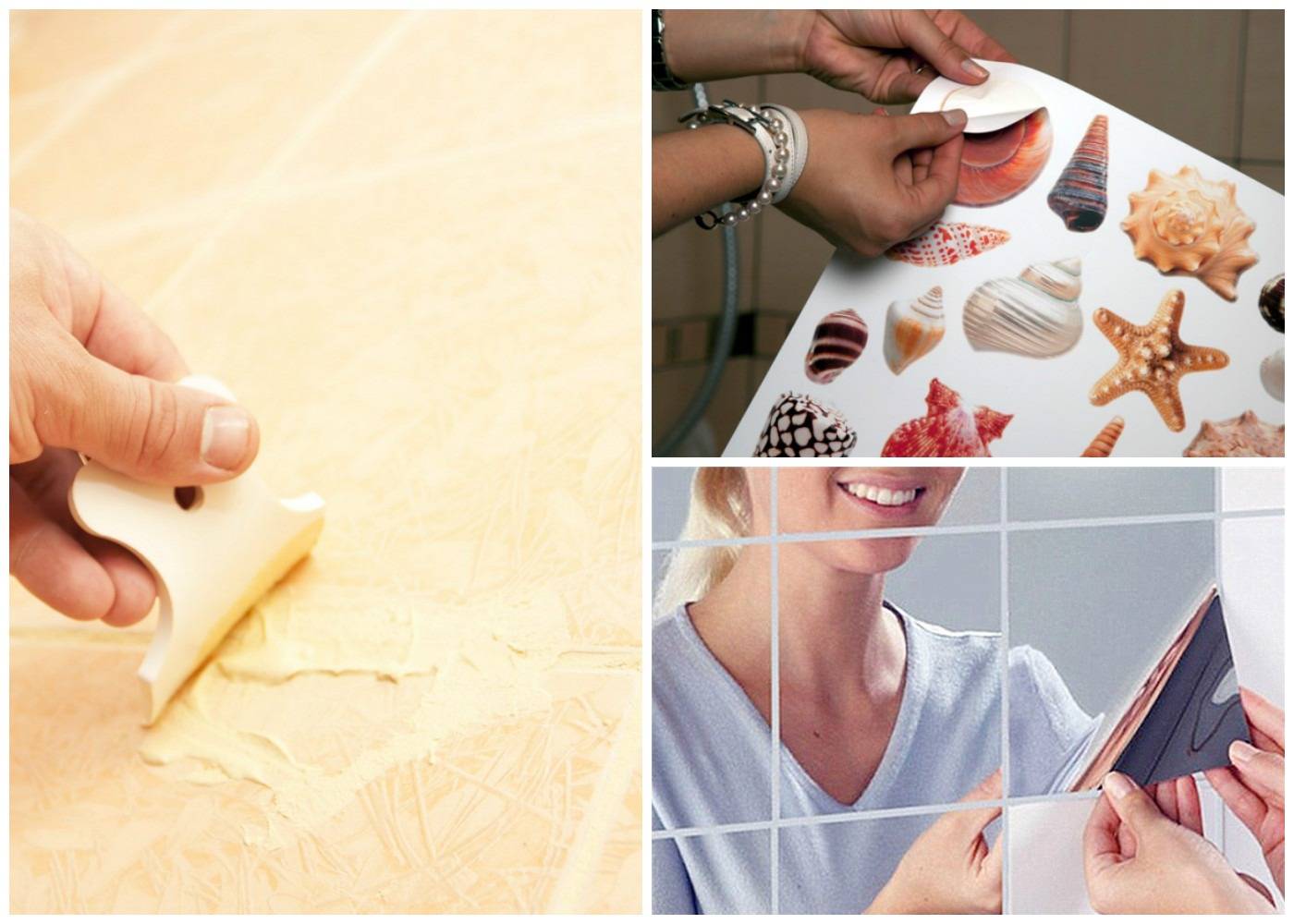 Этот метод не отнимает много времени, а необходимость в реконструкции плитки отпадает. Наклейки позволят скрыть многочисленные неровности и трещины.