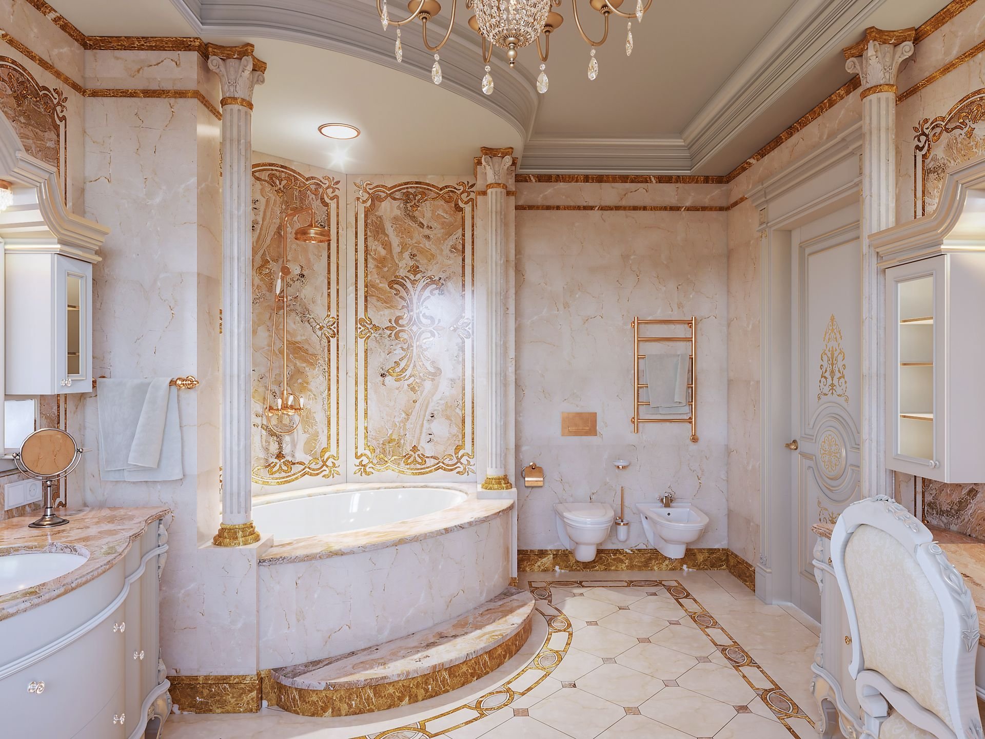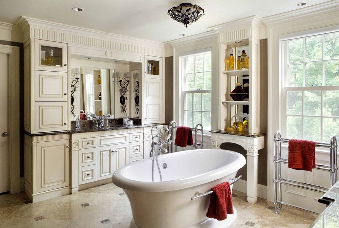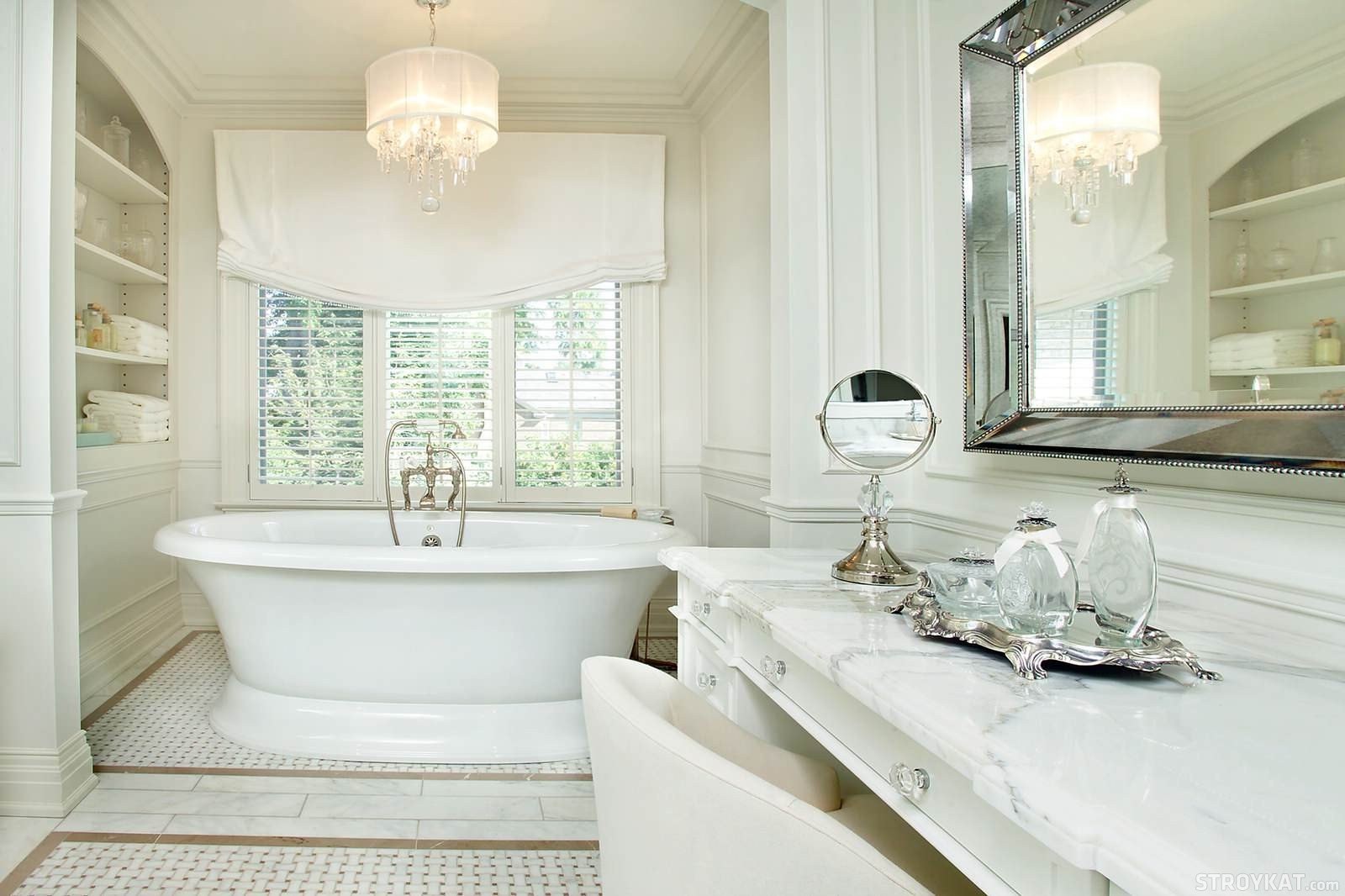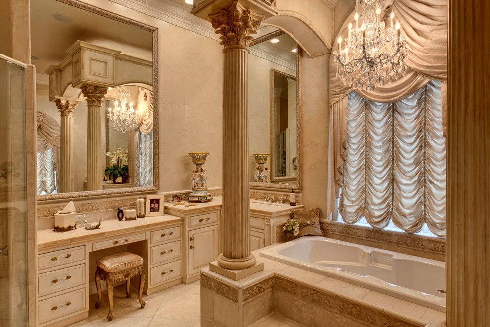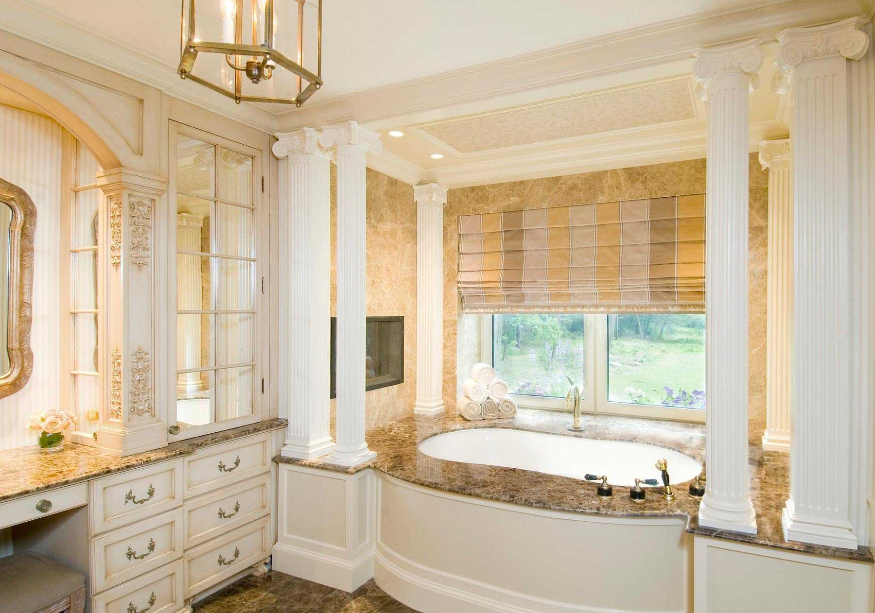 Ванную можно установить как по центру комнаты, так и в эркере. Иногда применяется подиум. Джакузи в классическом интерьере место также найдется.