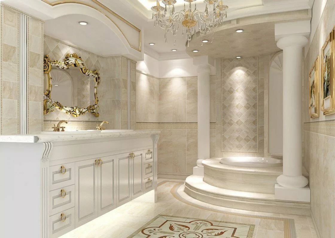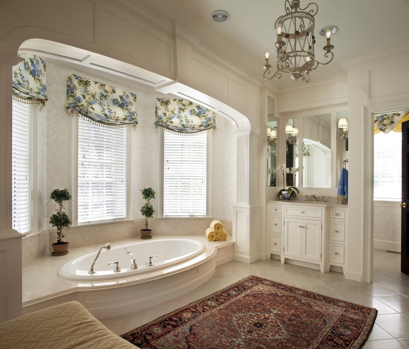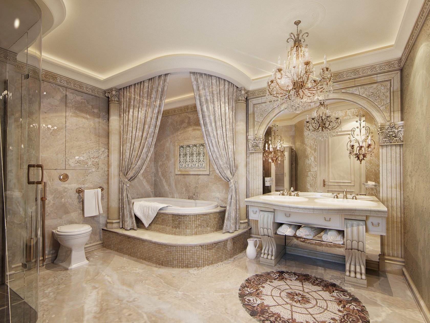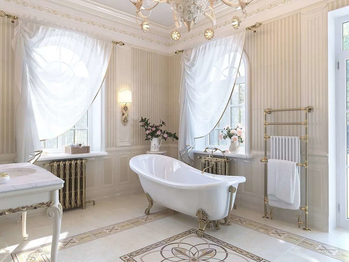 Ванную можно установить как по центру комнаты, так и в эркере. Иногда применяется подиум. Джакузи в классическом интерьере место также найдется.