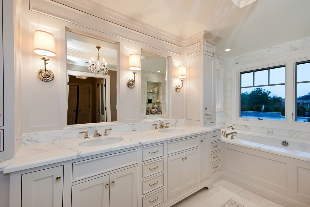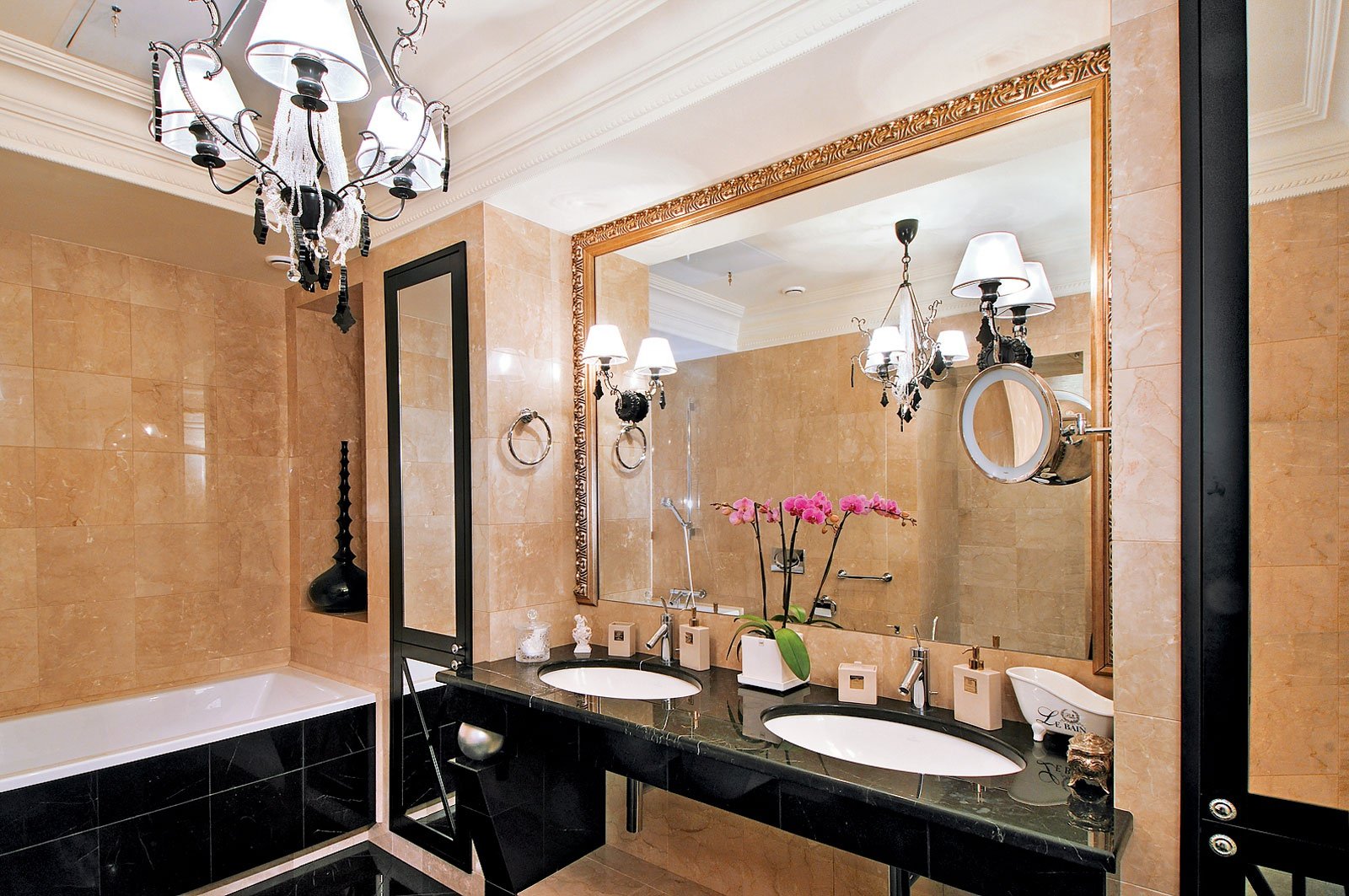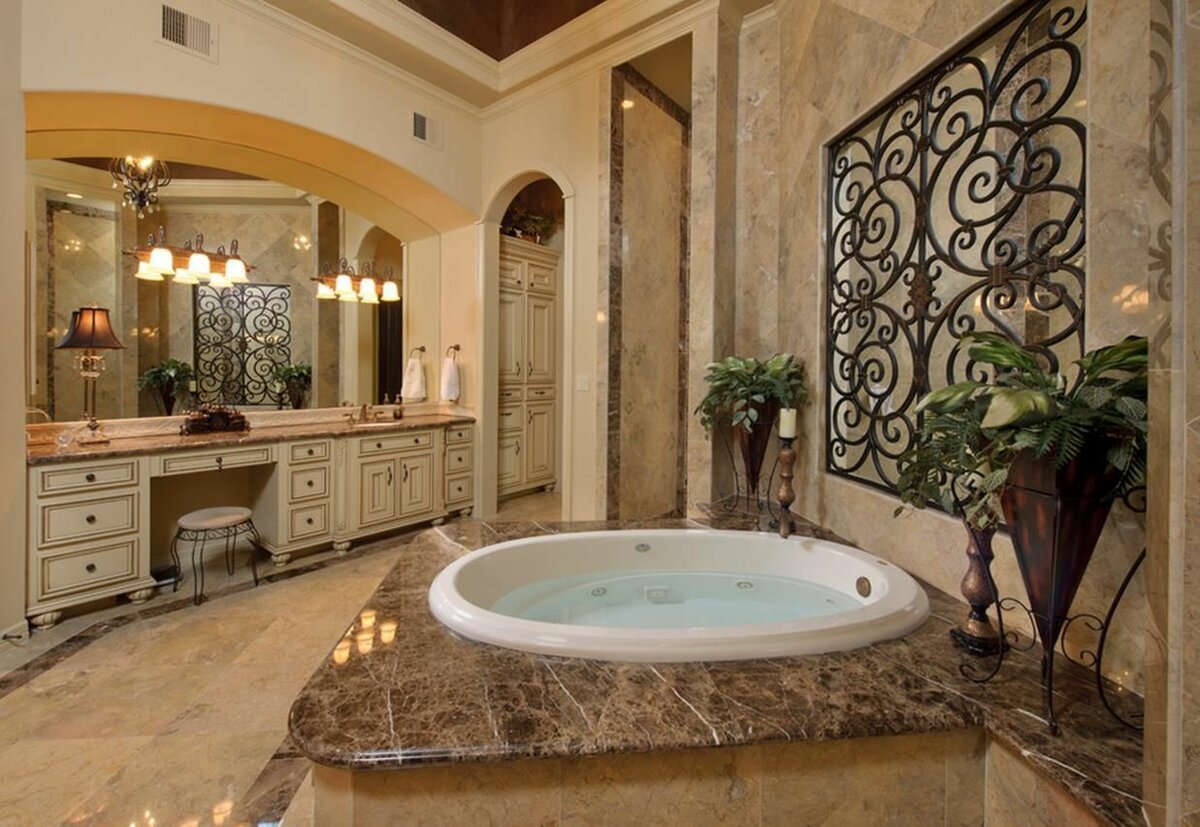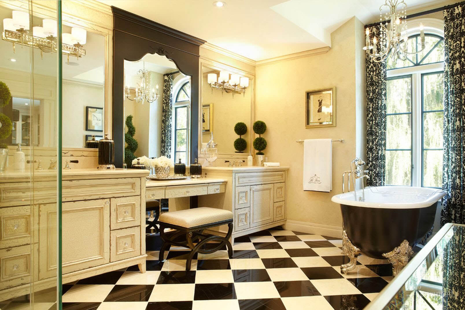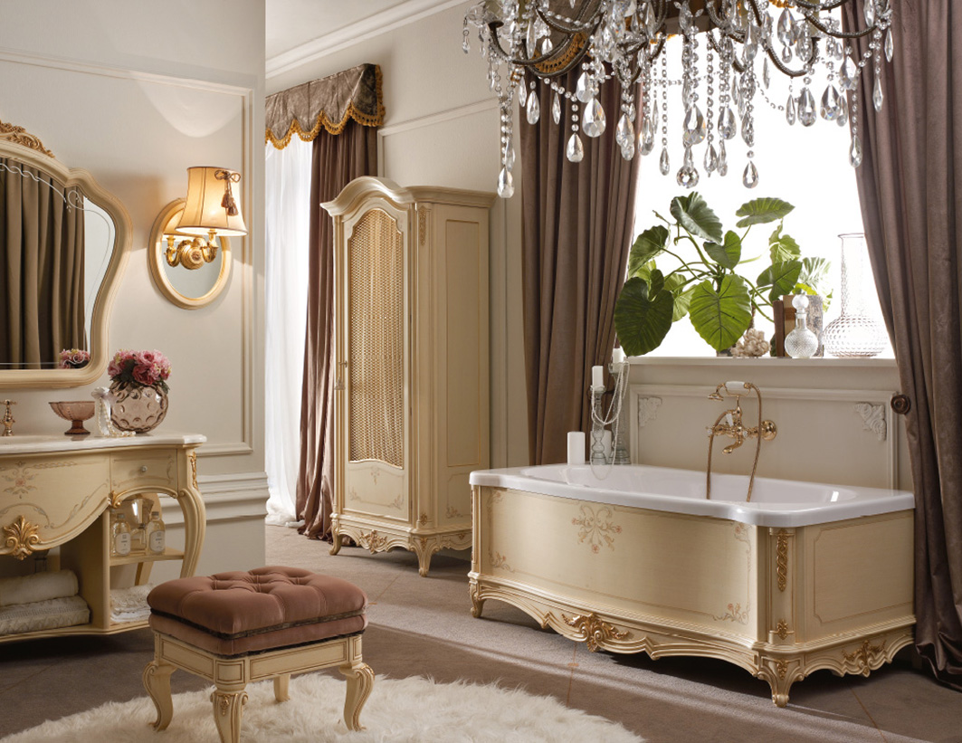 Ванную можно установить как по центру комнаты, так и в эркере. Иногда применяется подиум. Джакузи в классическом интерьере место также найдется.