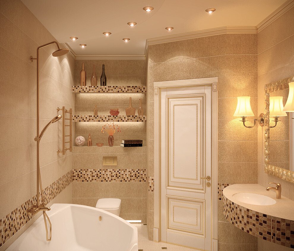 Система освещения в ванной очень важна. Свет можно сделать многоуровневым, но ненавязчивым. Нужный эффект достигается за счет точечно расположенных светильников, монтируемых в подвесные потолки. Их обязательно располагают над ванной и над зеркалом.