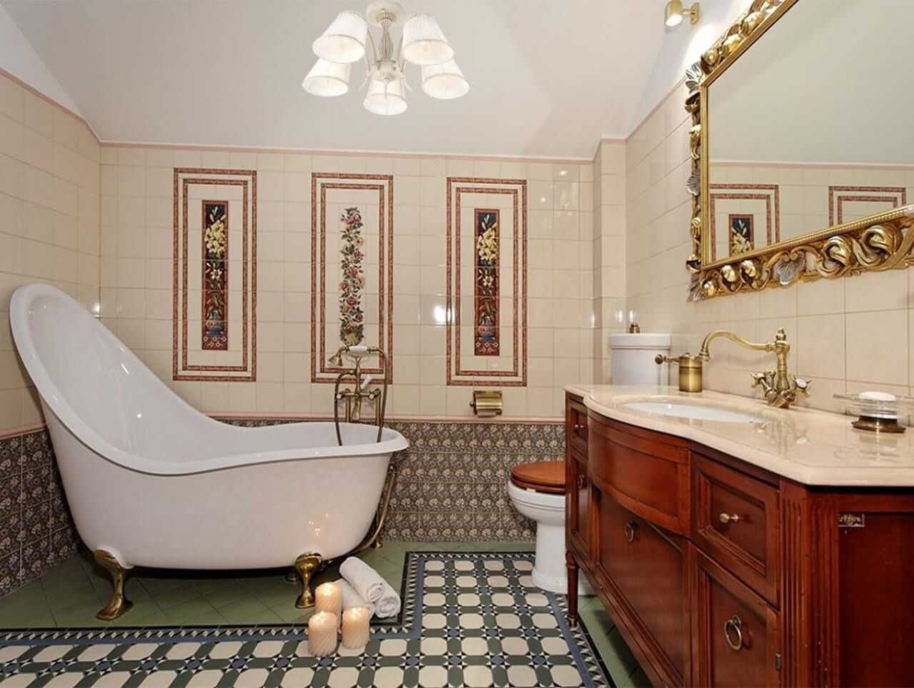 Кран в классическом интерьере ванной рекомендуется сделать «под старину», он должен иметь фигурные вентили. Бронзовые предметы и изделия из нержавеющей стали с покрытием, имитирующим золото либо серебро, также станут удачным решением.