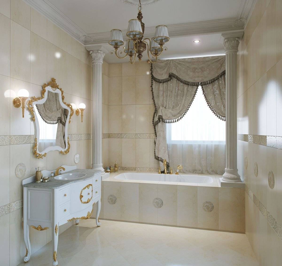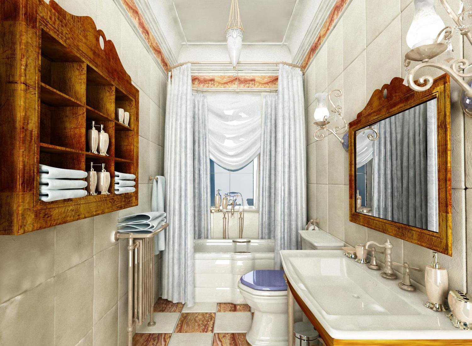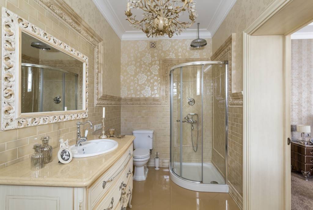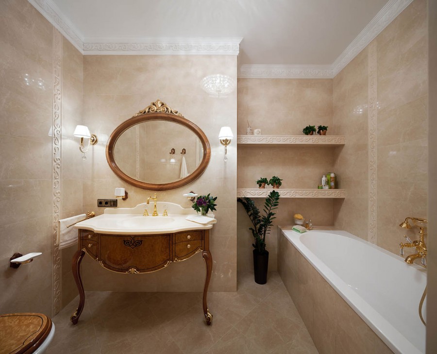 Классический интерьер сложно представить без добротной меблировки, отделки поверхностей, выполненной при помощи натуральных материалов. Главное — помнить, что в ванной комнате царит высокая влажность, отрицательно влияющая на древесину и мрамор. Придется позаботиться об их защите. Многие владельцы домов и квартир жертвуют эстетикой во имя практичности.