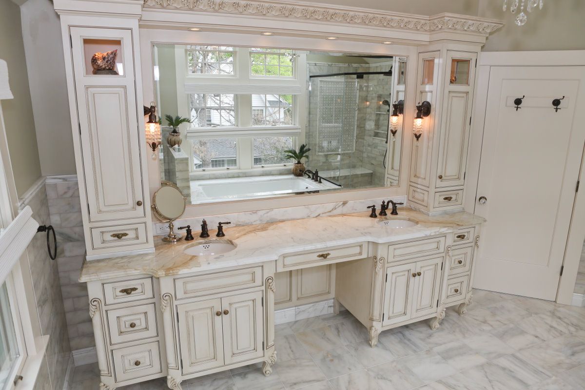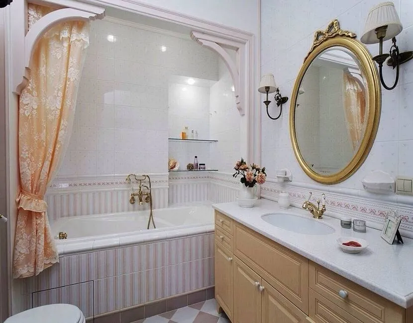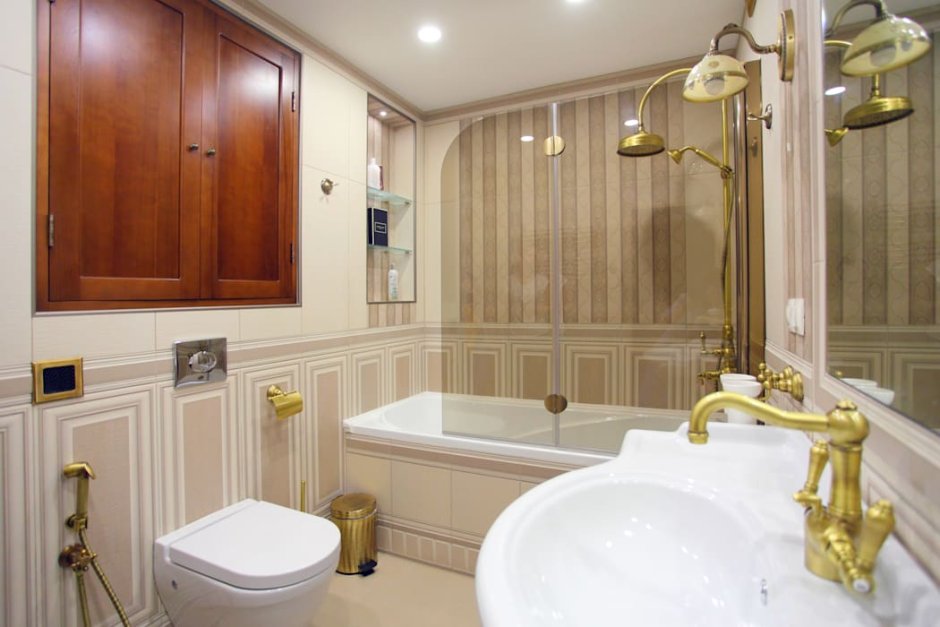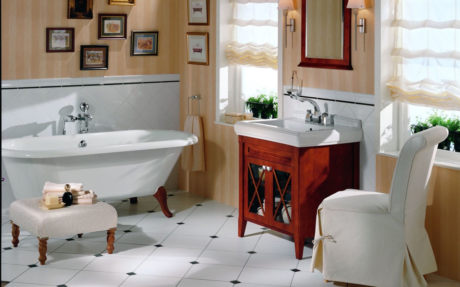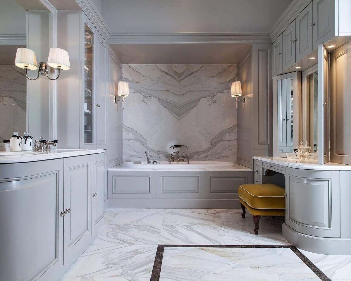 Классический интерьер сложно представить без добротной меблировки, отделки поверхностей, выполненной при помощи натуральных материалов. Главное — помнить, что в ванной комнате царит высокая влажность, отрицательно влияющая на древесину и мрамор. Придется позаботиться об их защите. Многие владельцы домов и квартир жертвуют эстетикой во имя практичности.