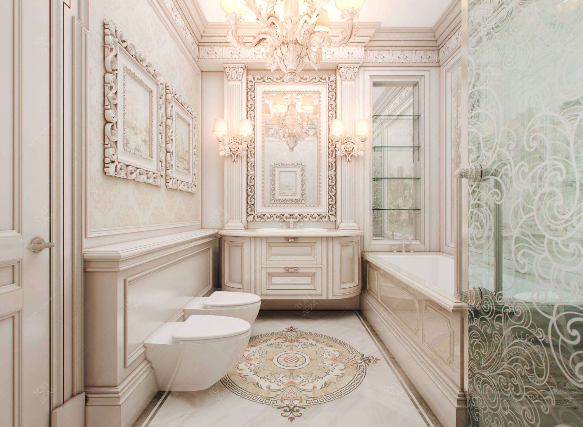 Главным интерьерным элементом выступает ванна. Строгие ограничения в ее декоре отсутствуют, но классическая белоснежная емкость на украшенных резьбой ножках, будет смотреться максимально гармонично. Можно поместить ее в центр планировки.