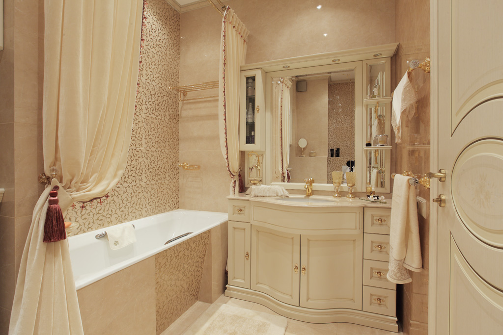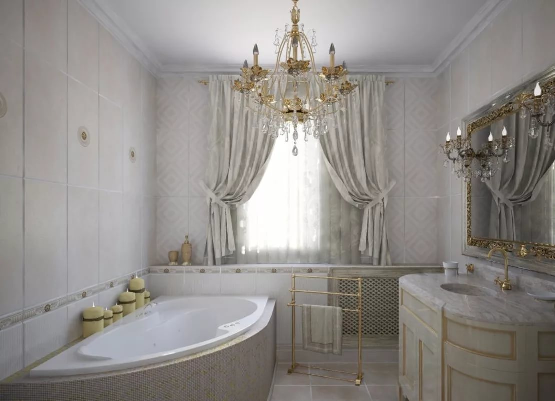 Предметы декора для классической ванной следует подбирать очень тщательно. Роль аксессуаров играют полотенца, коврики и, естественно, шторы. Последние не только скрывают помещение от посторонних взоров, но и способствуют созданию уютной атмосферы. Окно в ванной можно закрыть римскими либо классическими шторами. Их также можно использовать для ограждения купели.
