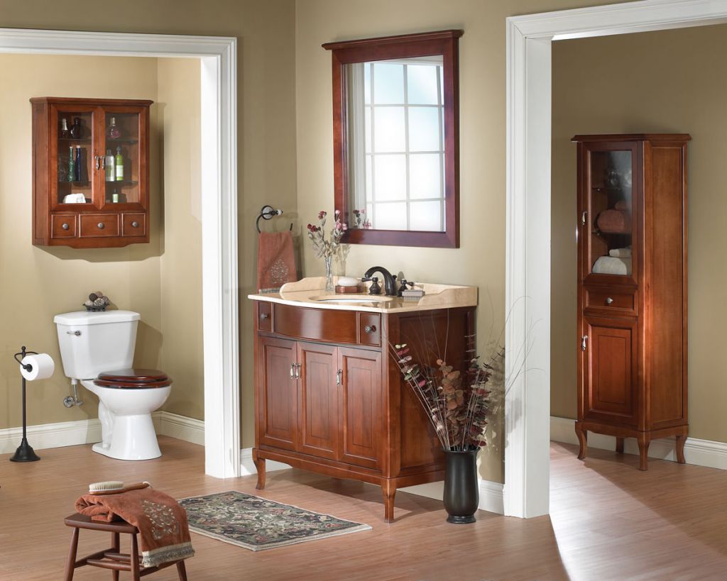 При обустройстве ванной комнаты нужно учитывать ее площадь. Настенные ящики с полочками входят в обязательный мебельный набор. Деревянные объекты с классическими фасадами, ручками из металла, зачастую окрашенные в благородный оттенок тоже применяются.