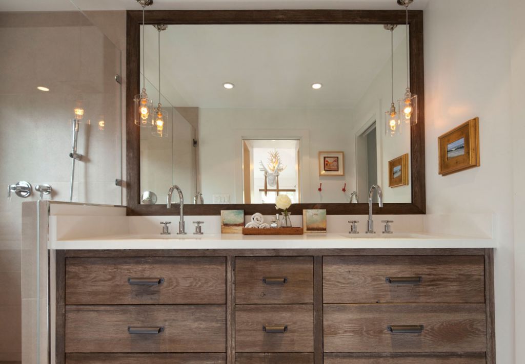 - Зеркала и картины в деревянных рамах. Присутствие картин и зеркал в деревянных простых рамках придает интерьеру ванной уют настоящей комнаты.