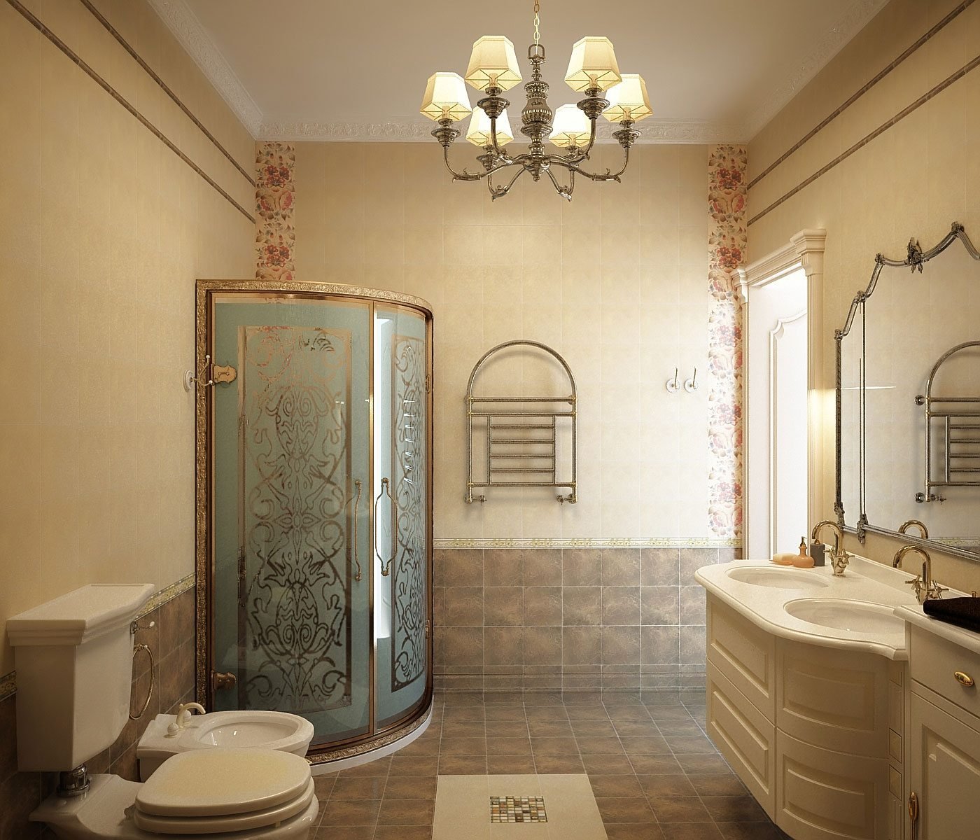 В интерьере классической ванной может быть не только купель, но и душевая кабинка. В продаже можно отыскать презентабельные витражные ограждения, а также стандартные двери из стекла. Главное, чтобы в глаза не бросались современные сантехнические детали.