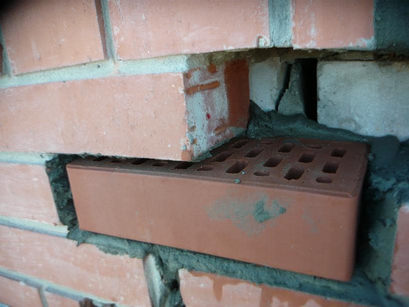 Перед укладкой целого кирпича взамен удаленного, сначала забиваются все трещины в глубине кладки. Там, где трещины