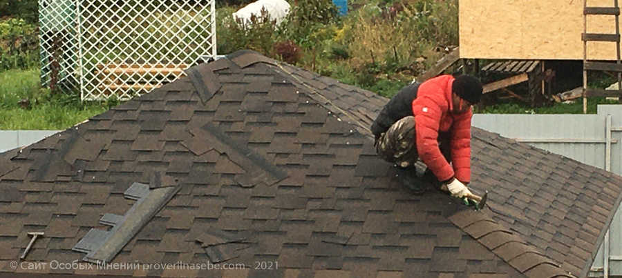 Затем на рейки были положены листы OSB толщиной 12 миллиметров. И уже на них аккуратно уложили слой мягкой черепицы. Такой же, как на крыше дома. Стоимость этого удовольствия зашкаливала. Особенно, учитывая очень неподходящий момент, 2021 год — когда цены на стройматериалы значительно выросли.