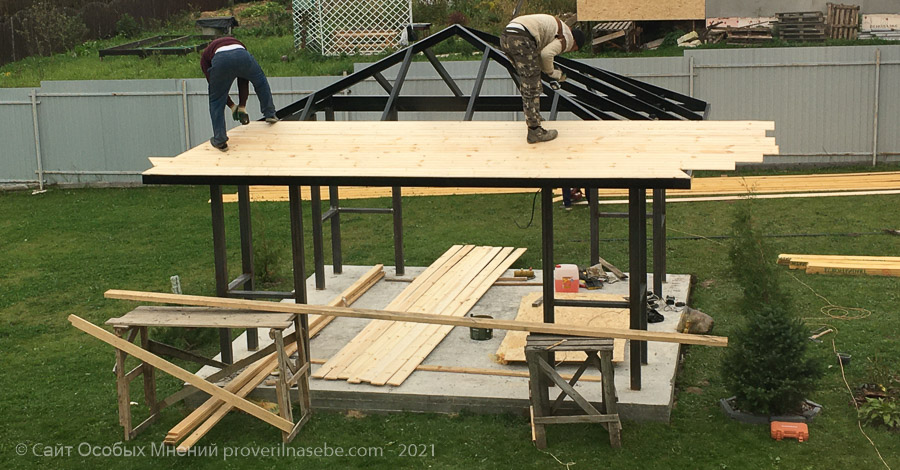 Был приведен пример устройства односкатной крыши для деревянной беседки. Устройство односкатной крыши из металла отличается только материалом и способом крепления (саморезы, анкера для дерева, сварка – для металла). Обрешетка крепится прямо к стропилам из профильных труб.