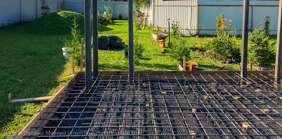 Для основания используется комбинация бетонных и кирпичных столбов. Связано это с уклоном грунта, и, вероятные всего, потому что у автора остался лишний кирпич .