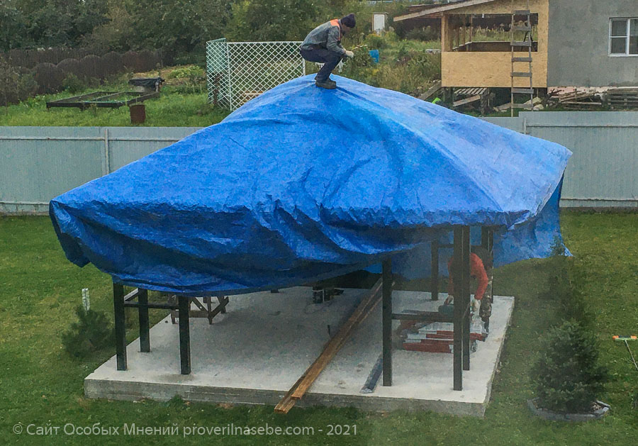 Интересно, что в перерывах между работами крыша накрывалась пленкой, чтобы случайный дождь не подмочил репутацию будущего строения и самих исполнителей. Если бы я делал все сам, где бы я взял такой кусок пленки? Покупать на один раз — слишком затратно. Напрокат — вряд ли у кого найдется кусок такого размера. Вот из таких нюансов и сложилось мое мнение о том, как это правильно, что я пригласил специалистов. Сам бы потратил море времени и нервов. И не факт, что получилось бы так же хорошо.