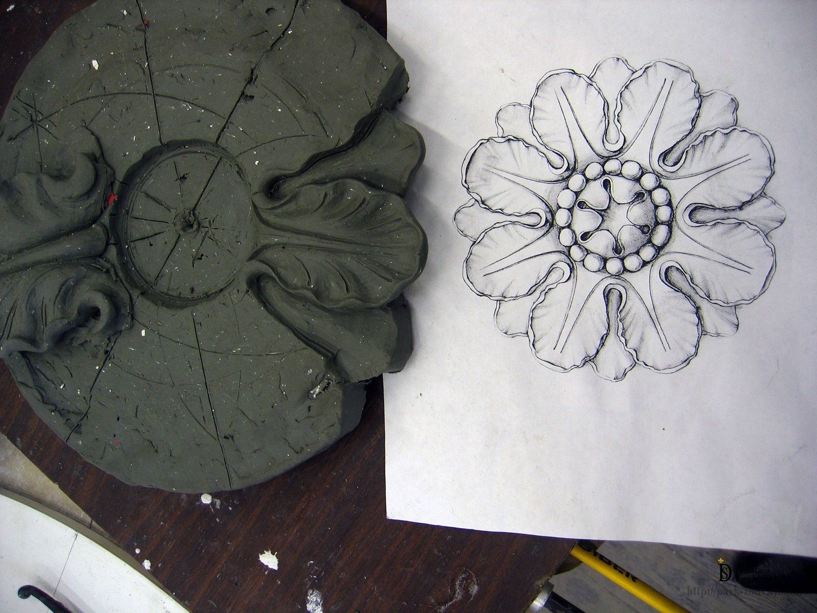 По распечатанной версии с помощью глины или пластилина вылепливается макет большего размера, чем будет сама лепнина.