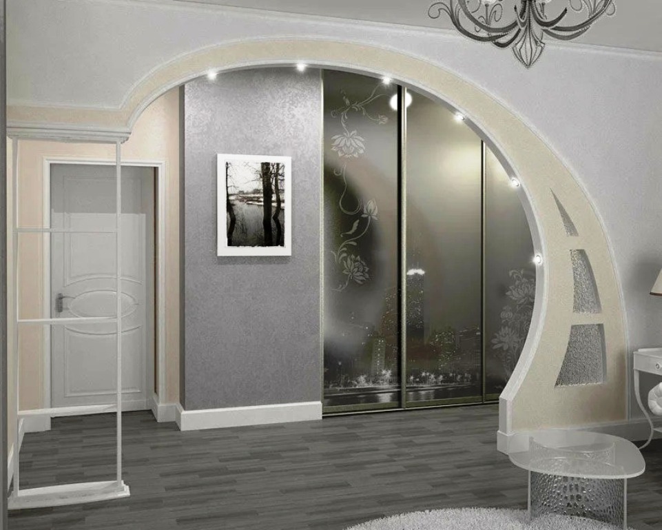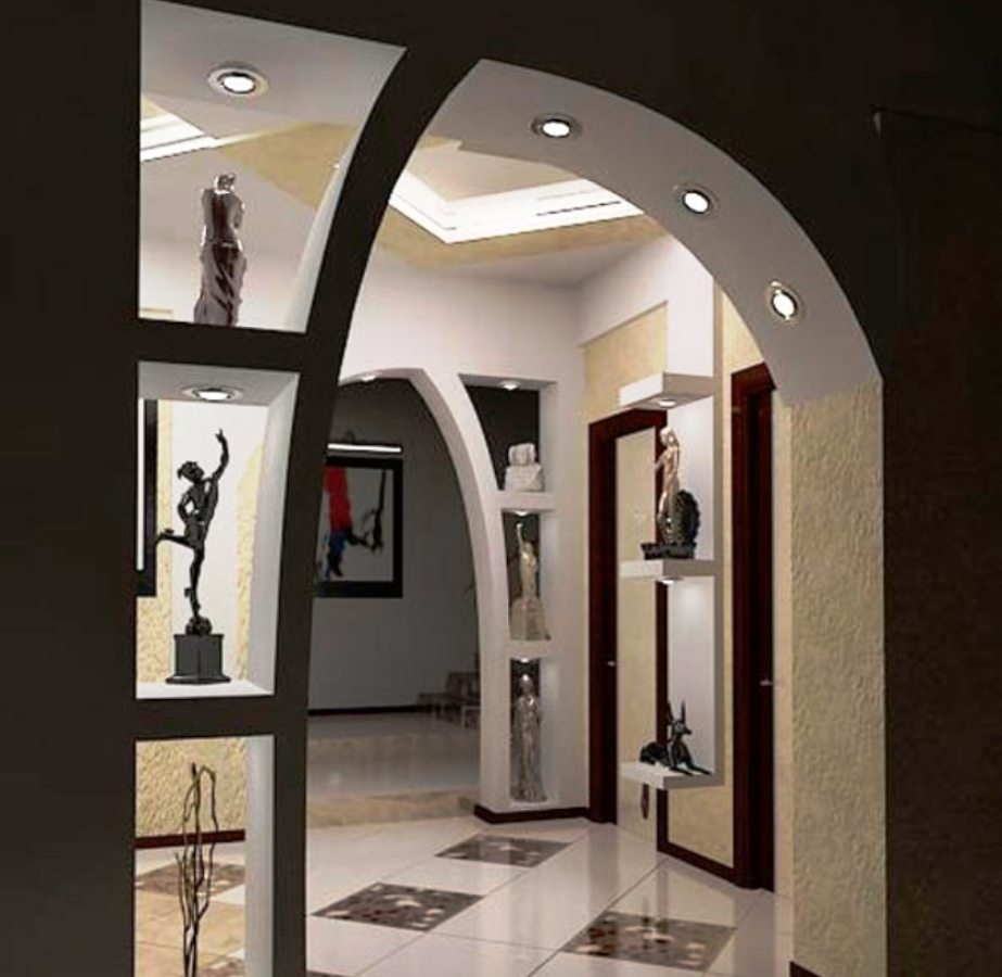 - В арочные перегородки или двухуровневые стены можно встроить точечные светильники, что создаст особую интересную атмосферу и дополнительное освещение.