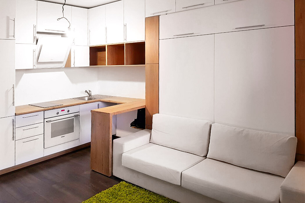 Если в стандартной студии поставить обычную кровать, она займет четыре квадратных метра. Для квартиры площадью 20–30 «квадратов» это значительная потеря пространства. Поэтому большинству владельцев студий приходится спать на раздвижном диване. Молодой семье, купившей студию в жилом комплексе «Арбан SMART», удалось установить в ней полноценную двуспальную кровать с ортопедическим матрасом, которая не занимает много места. В течение дня местом для сидения служит приставной диван. Вечером кровать опускается на основание дивана, утром спальное место убирается в шкаф.