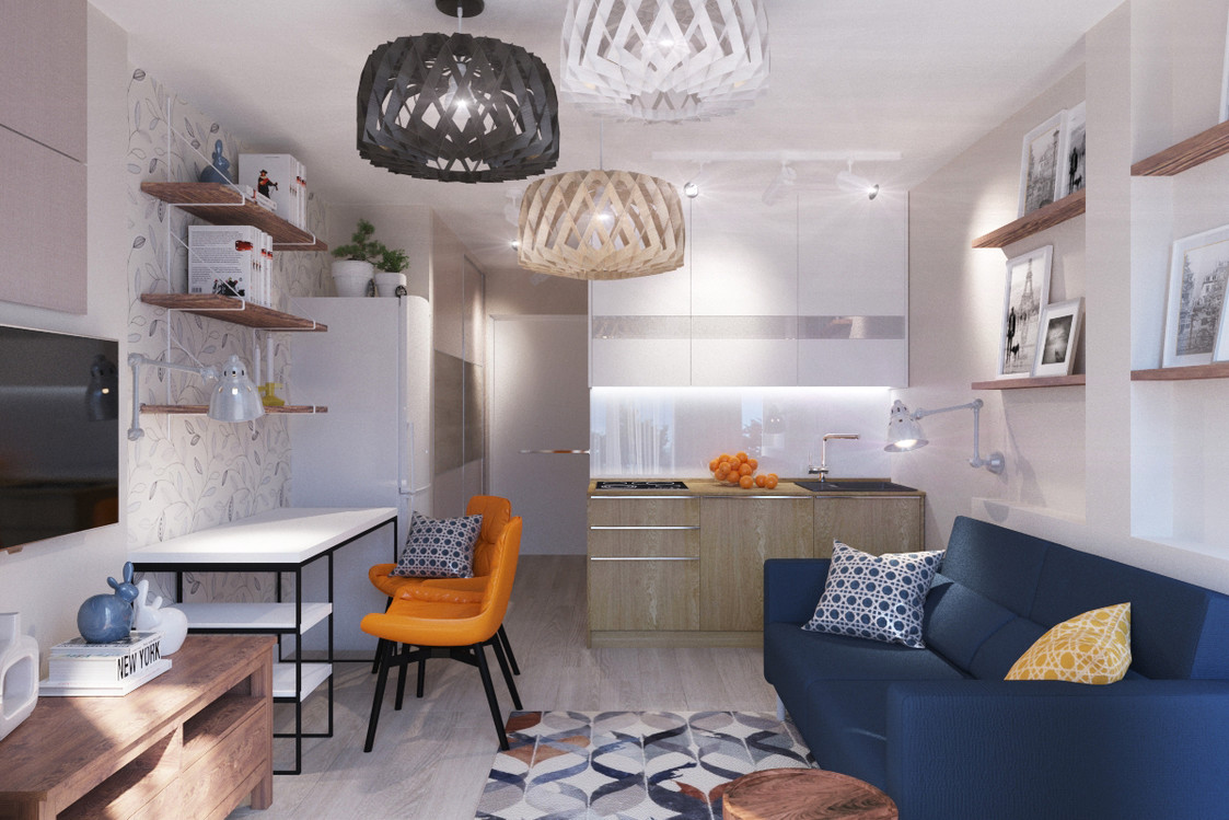 В данном случае дизайн прямоугольной маленькой квартиры кажется очень гармоничным за счёт обильного дневного освещения. Однако если ваша малогабаритка находится в теневой стороне это не означает что такого эффекта нельзя добиться искусственным путём. Как именно? Узнаем дальше.