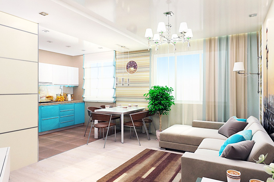 На зону гостиной отводится основная площадь квартиры, это вызвано необходимостью обеспечить достаточную комфортность времяпрепровождения. Для зоны отдыха рекомендуется приобрести компактную и многофункциональную мебель, например, диван или стол-трансформер.