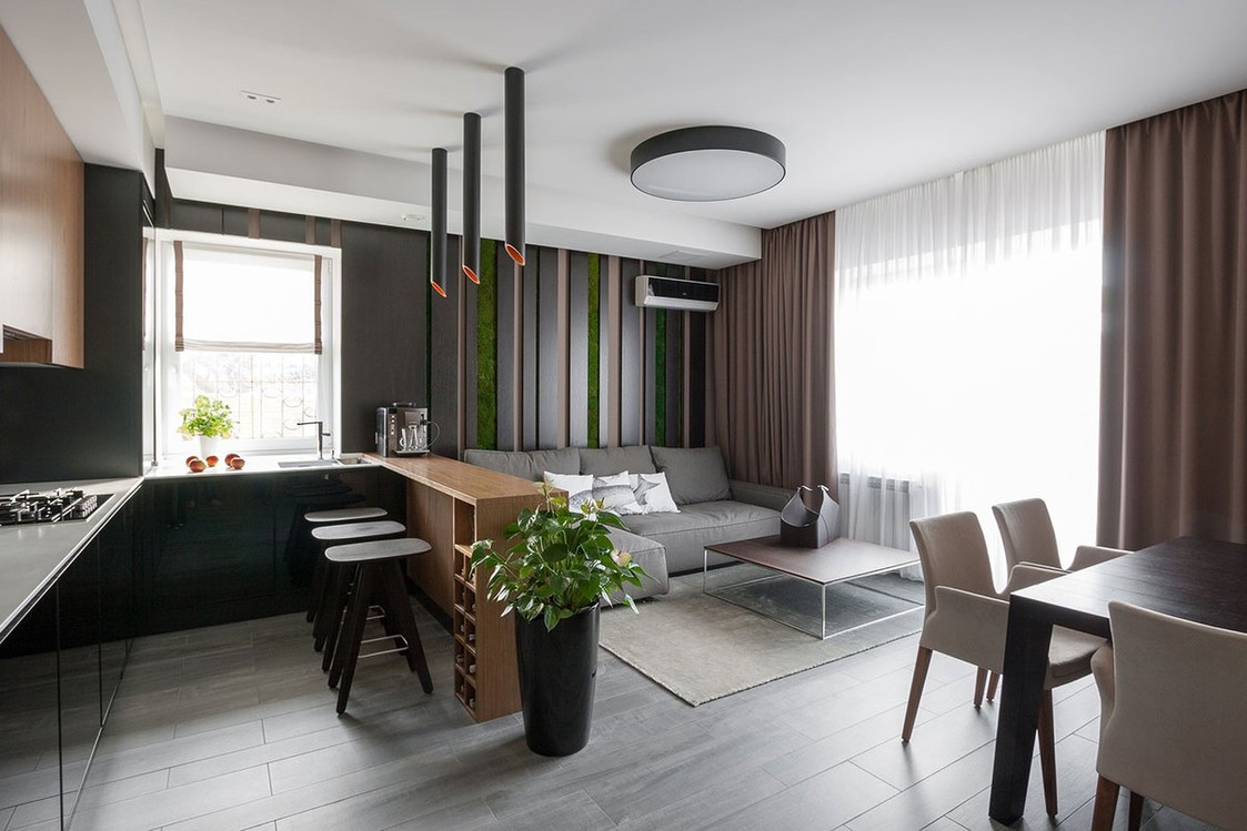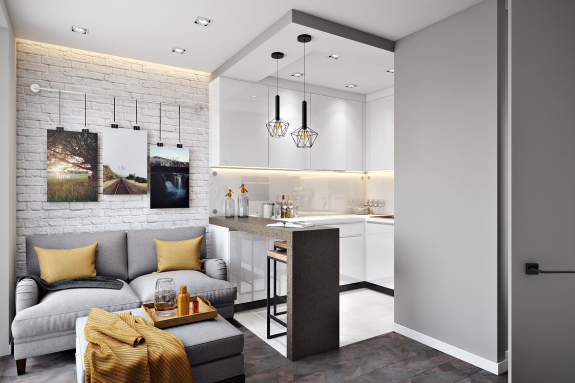 - желательно размещать кухонную зону в нишах и возводить невысокую стационарную перегородку или барную стойку. На перегородку, со стороны гостиной, можно навесить телевизор, а поверхность, выходящую на кухню, облицевать стеклом.