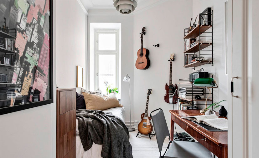 Открытые полки и стеллажи – также базовый принцип скандинавского стиля. Это возможность выразить свою индивидуальность, разместив на виду свое хобби, и в то же время избавиться от хлама и хаоса закрытых шкафов.