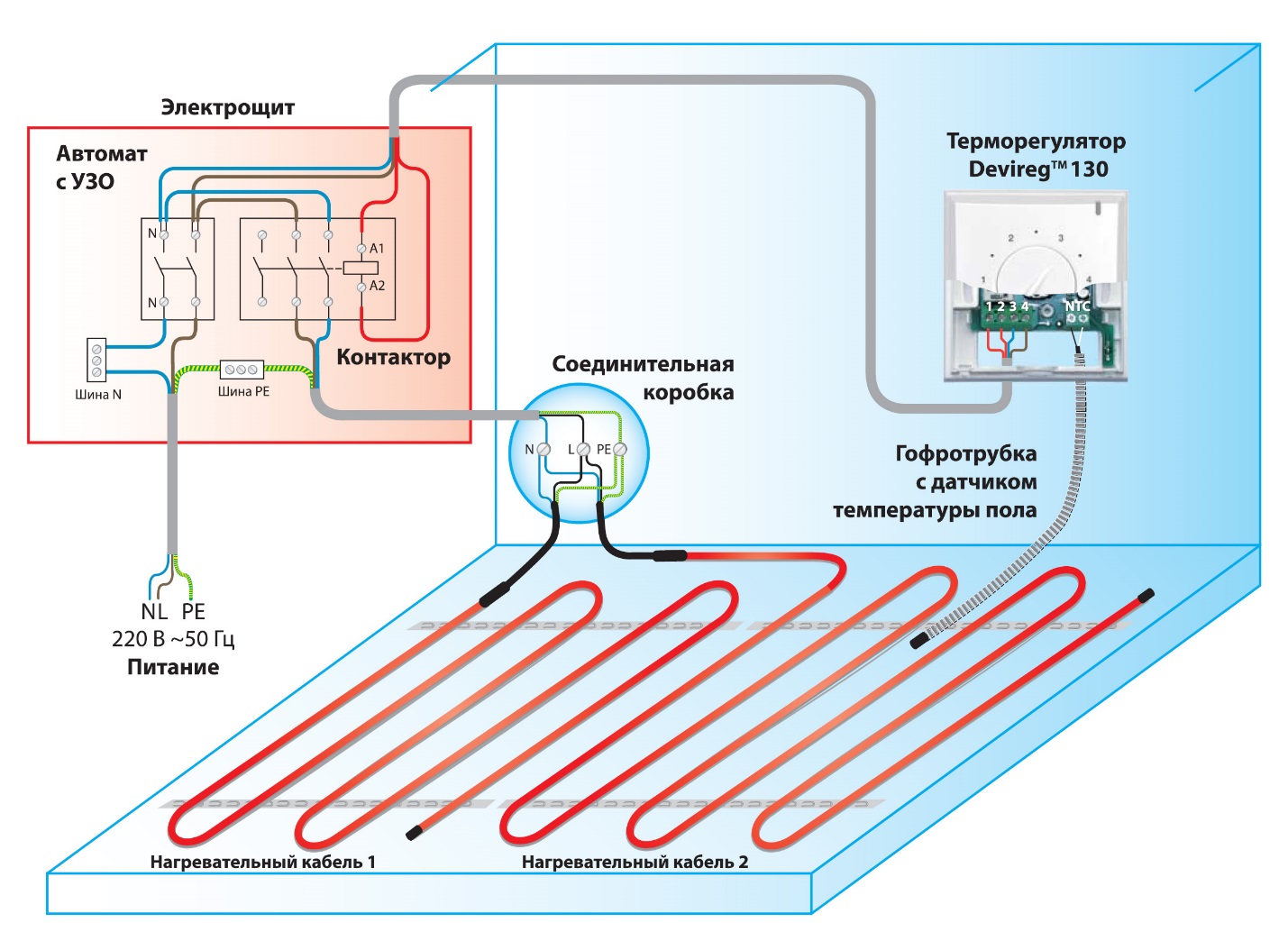 Важный момент: согласно ПУЭ (правилам устройства электроустановок), матовый электропол нужно подключать к сети 220 В только через устройства защитного отключения. УЗО позволит исключить вероятность поражения людей электрическим током при случайном повреждении токопроводящих элементов в матах. Не стоит пренебрегать этим требованием безопасности, поскольку бетон, напольная плитка и другие стройматериалы при повышенной влажности способны проводить ток. Соответственно, при малейших повреждениях изоляции кабелей, из которых состоят термоматы, может произойти утечка электричества, и при хождении босиком по полу можно получить удар током.
