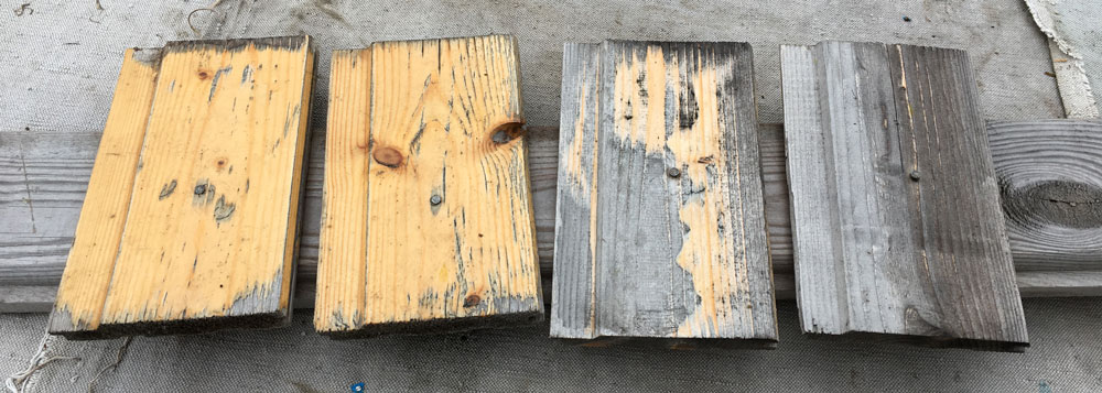 На фото они расположены в обратном порядке относительно исходного фото. Ну, просто вверх ногами сфотографировал, а переснять уже не получится. Самая правая дощечка совсем не была обработана. Нельзя сказать, что она сгнила, но стала серой. Таким со временем становится новенький деревянный забор, который люди ставят вокруг участка. Вторая дощечка была обработана пропиткой — результат почти тот же. Лишь местами, где слой оказался толще, покрытие сохранило свой первоначальный цвет.