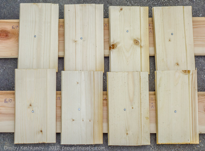 Суть: я взял 8 маленьких однотипных сосновых деревяшек, обрезков от вагонки. Первые две не красил ничем (Б/О — без обработки), просто оставил как есть. Вторую пару покрыл только пропиткой (П). Третью — только лаком (Л). Четвертую — сначала пропиткой, потом лаком (П+Л).
