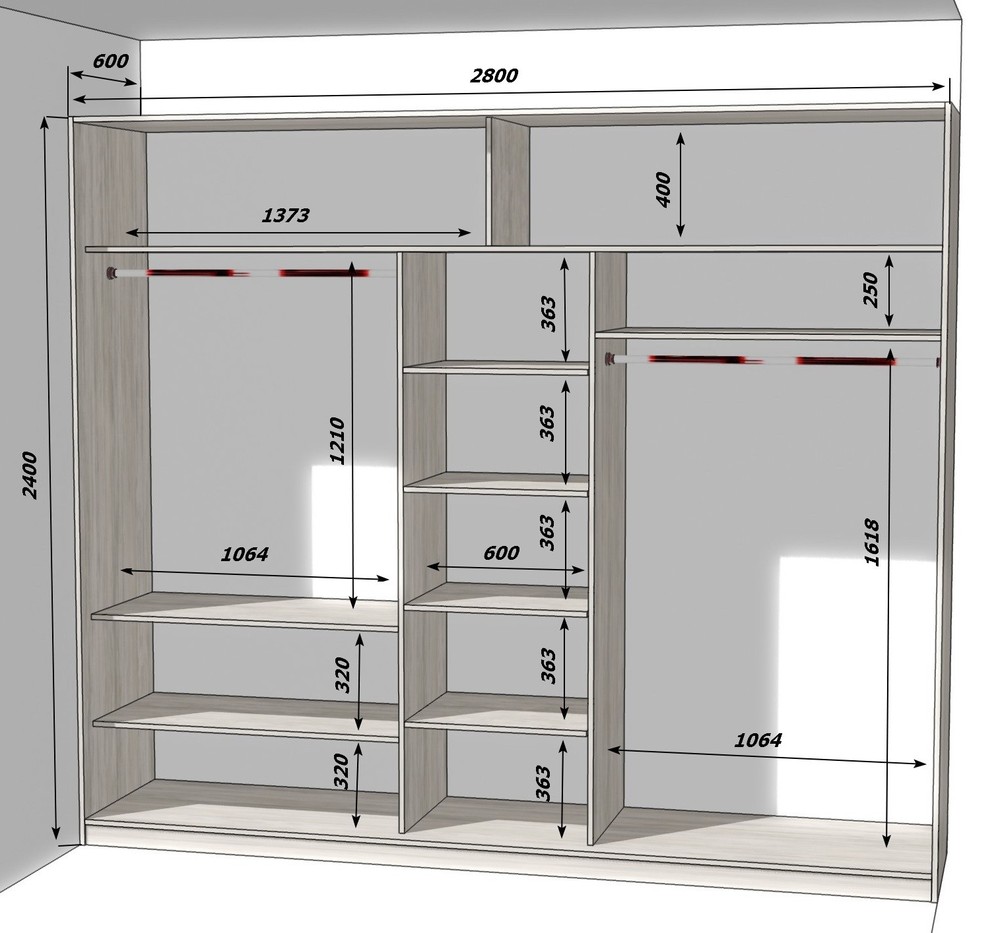 | Внутреннее пространство | Шкаф-купе можно разделить на разные зоны. полки, ящики, плечики для одежды, отделения для обуви и так далее. Распределение пространства внутри зависит от потребностей пользователя. |