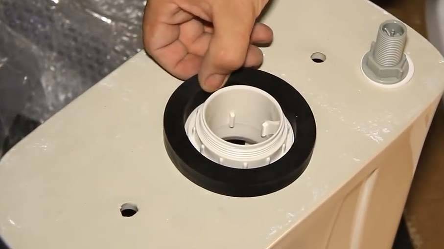 - Установите сливной механизм. Она входит в комплект уже в собранном виде. Установите резиновую прокладку на бачок. Далее одной рукой вложите механизм внутрь, а второй плотно прикрутите его гайкой.