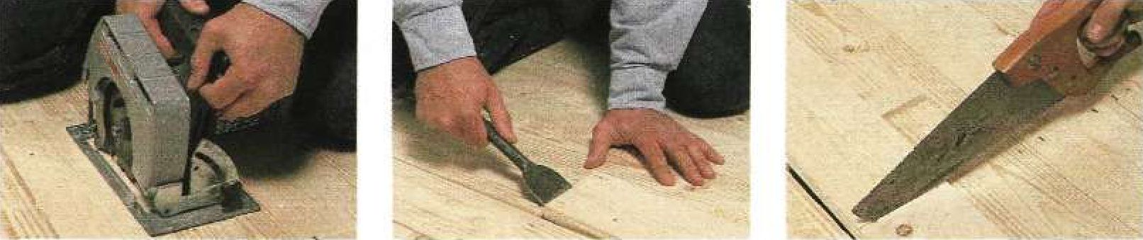 В том случае, если доска шпунтованная, срежьте шпунт циркулярной пилой. Поднимите конец доски за торец при помощи стамески. Вставьте клин под приподнятый конец доски и в том месте, где она ложится на балку, отрежьте ее ножовкой.