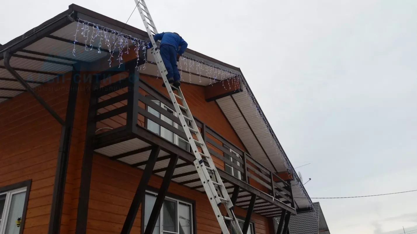 Очень красиво смотрится «бахрома». Натянуть ее можно как на скатную, так и на плоскую крышу. Целесообразно украсить гирляндой весь периметр, но при недостатке длины повесьте ее только со стороны улицы. Не менее эффектно выглядят «сосульки», гирлянды с лампочками в виде снежинок, шишек. Современный декор создаст лента дюралайт с неоновым свечением.